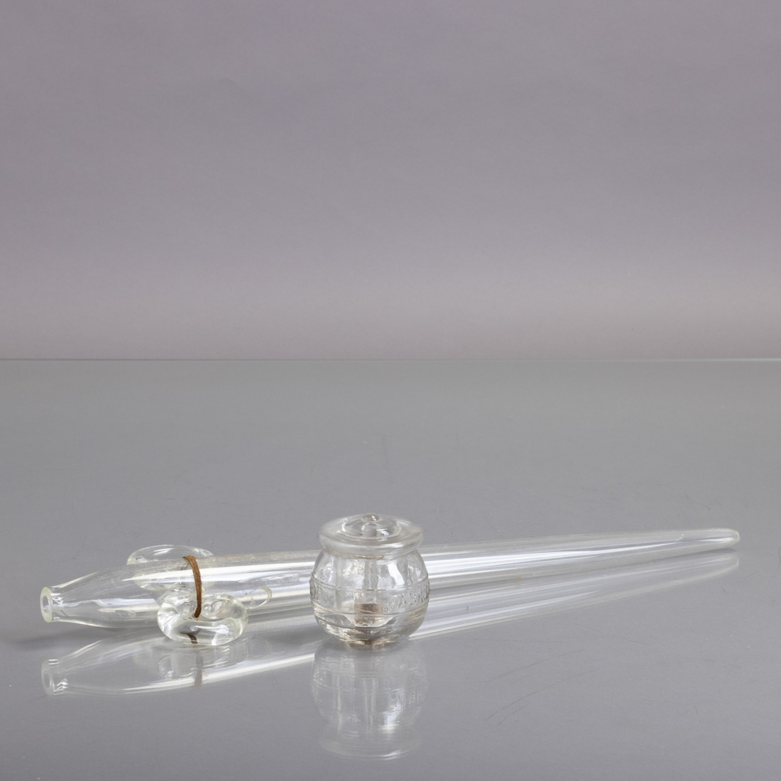 Em vidro, caixa da Marinha Grande. Séc. XIX/XX. Pipeta com defeitos, recipiente com esbeiçadela e cabelo.