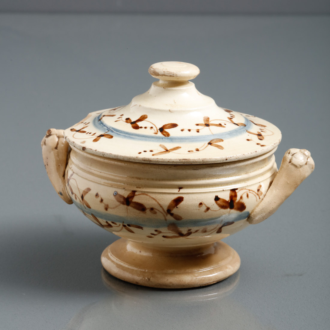 Em faiança portuguesa, decoração policromada com elementos vegetalistas. Sinais de uso, tampa com falha.