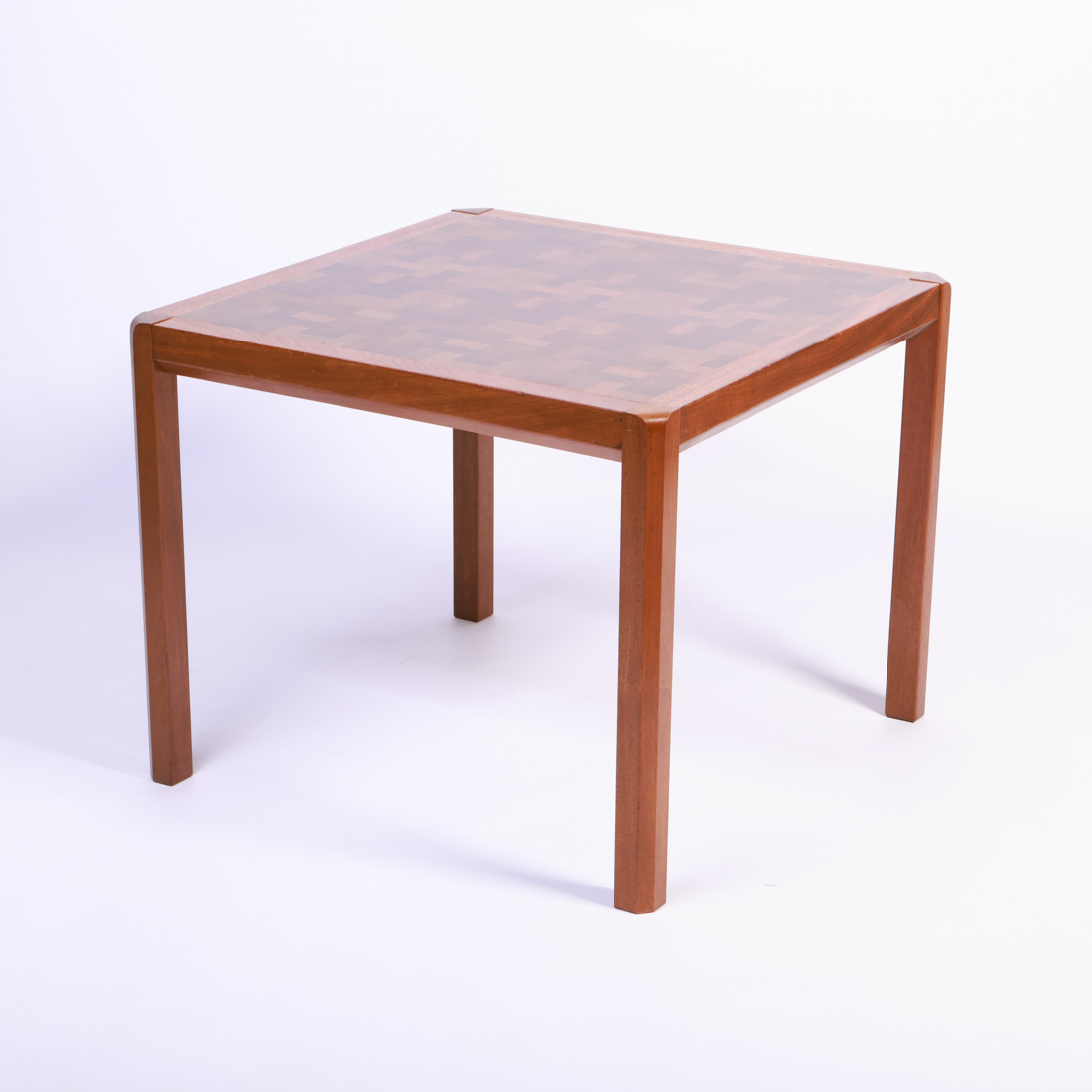 Em madeira, tampo com marchetaria em diferentes madeiras, fabrico de Tranekaer, Dinamarca. Marcada. Pequenos defeitos.