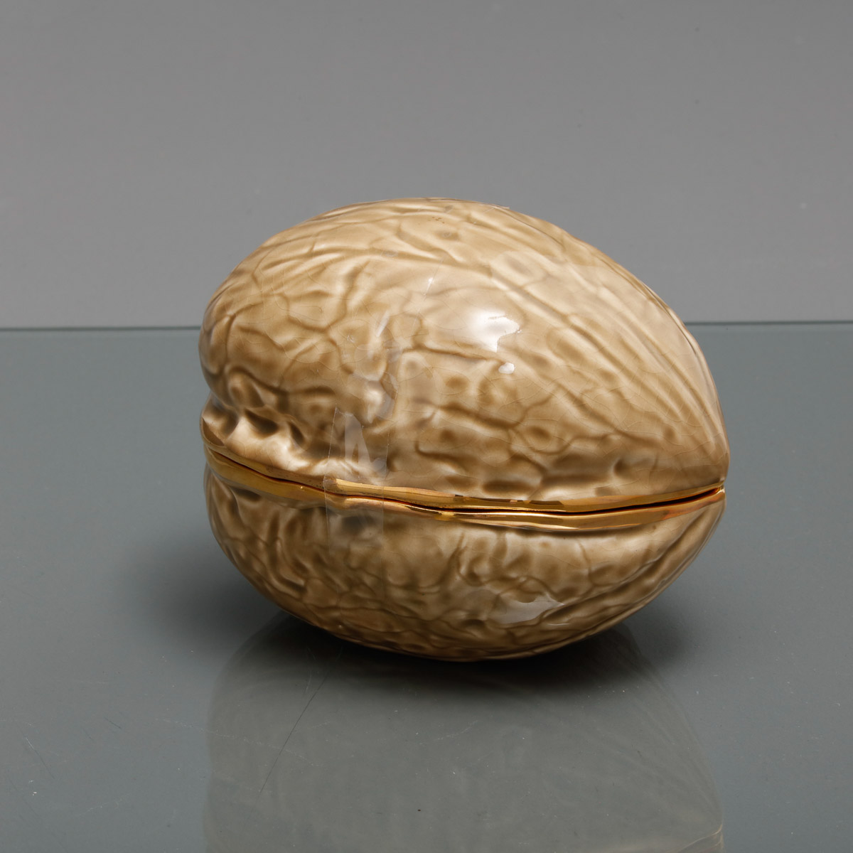 Em cerâmica vidrada marcada Aleluia, Aveiro, decoração relevada em tons de castanho claro e dourado. Sinais de uso.