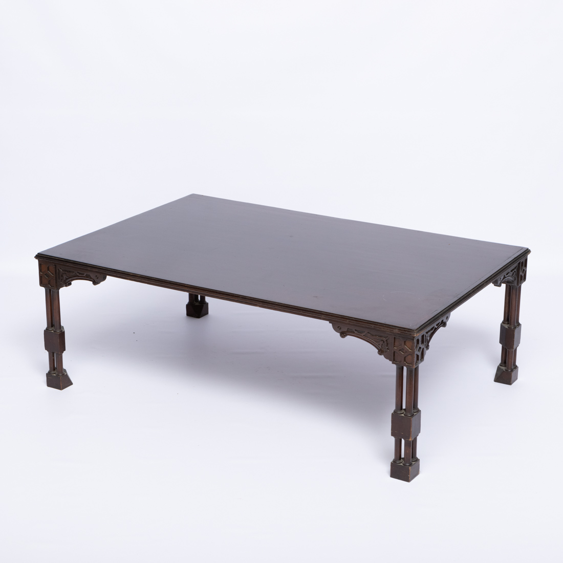 Em mogno e folheada a mogno com entalhamentos, pernas simulando cana. Sinais de uso e pequenos defeitos.