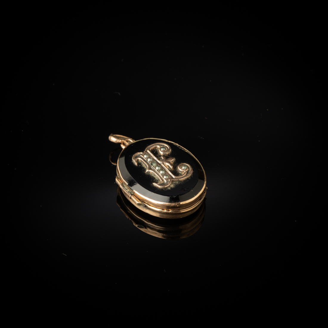 Em ouro de 9Kt., e ónix, com letra "E" cravejada com micropérolas. Pequenas falhas e amolgadelas.