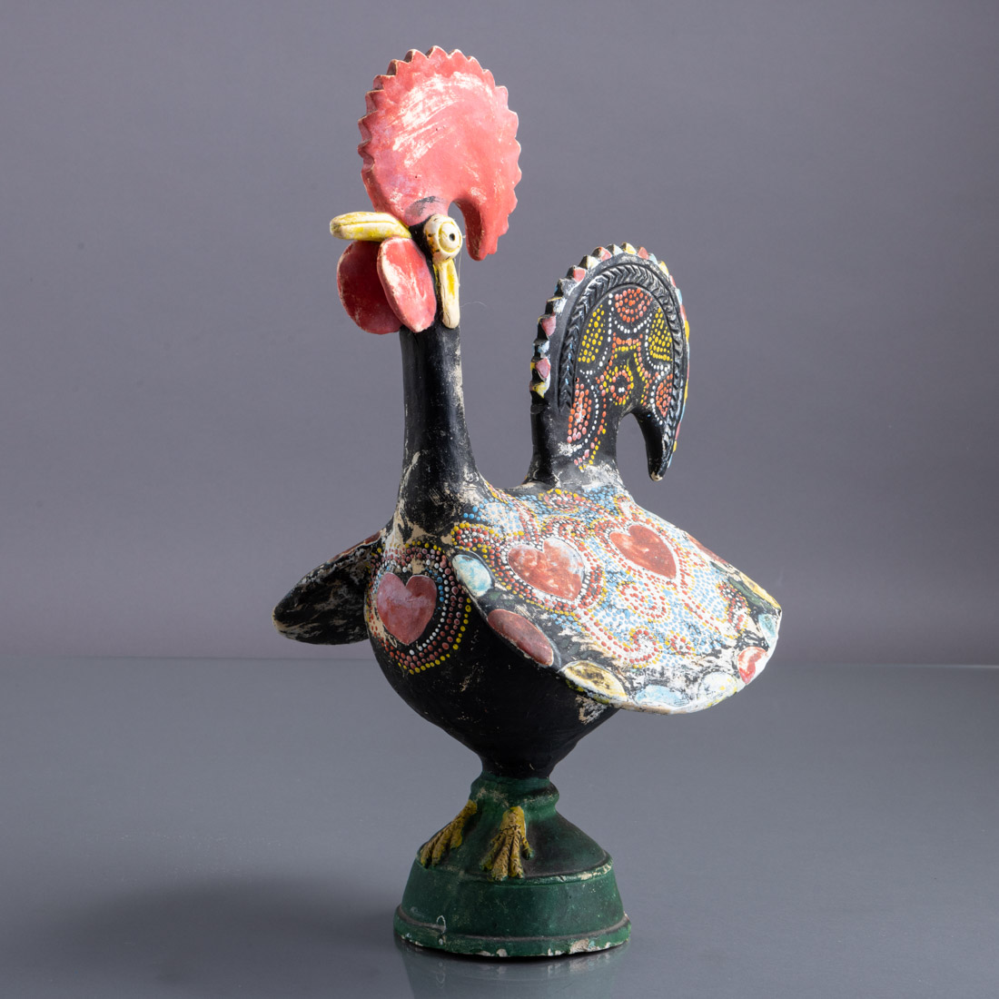 Escultura em barro de Barcelos, decoração policromada. Falhas na base e desgaste na pintura.