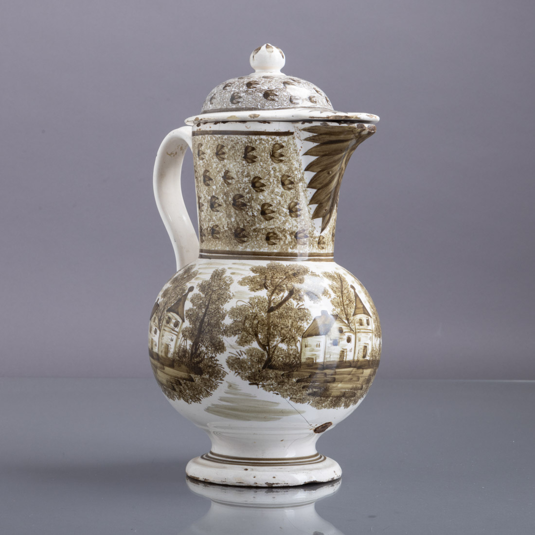 Em faiança portuguesa, decoração a verde "paisagem e casario". Séc. XIX. Esbeiçadelas, cabelos, restauro e asa colada.