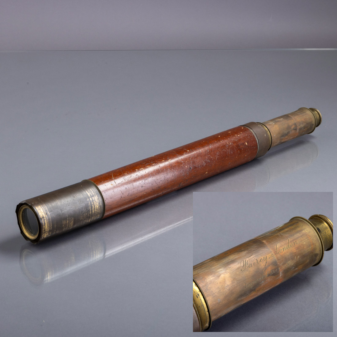 Em metal amarelo revestido a madeira. Inglês, Séc. XIX/XX, marcado Fairey London. Sinais de uso e pequenas amolgadelas.