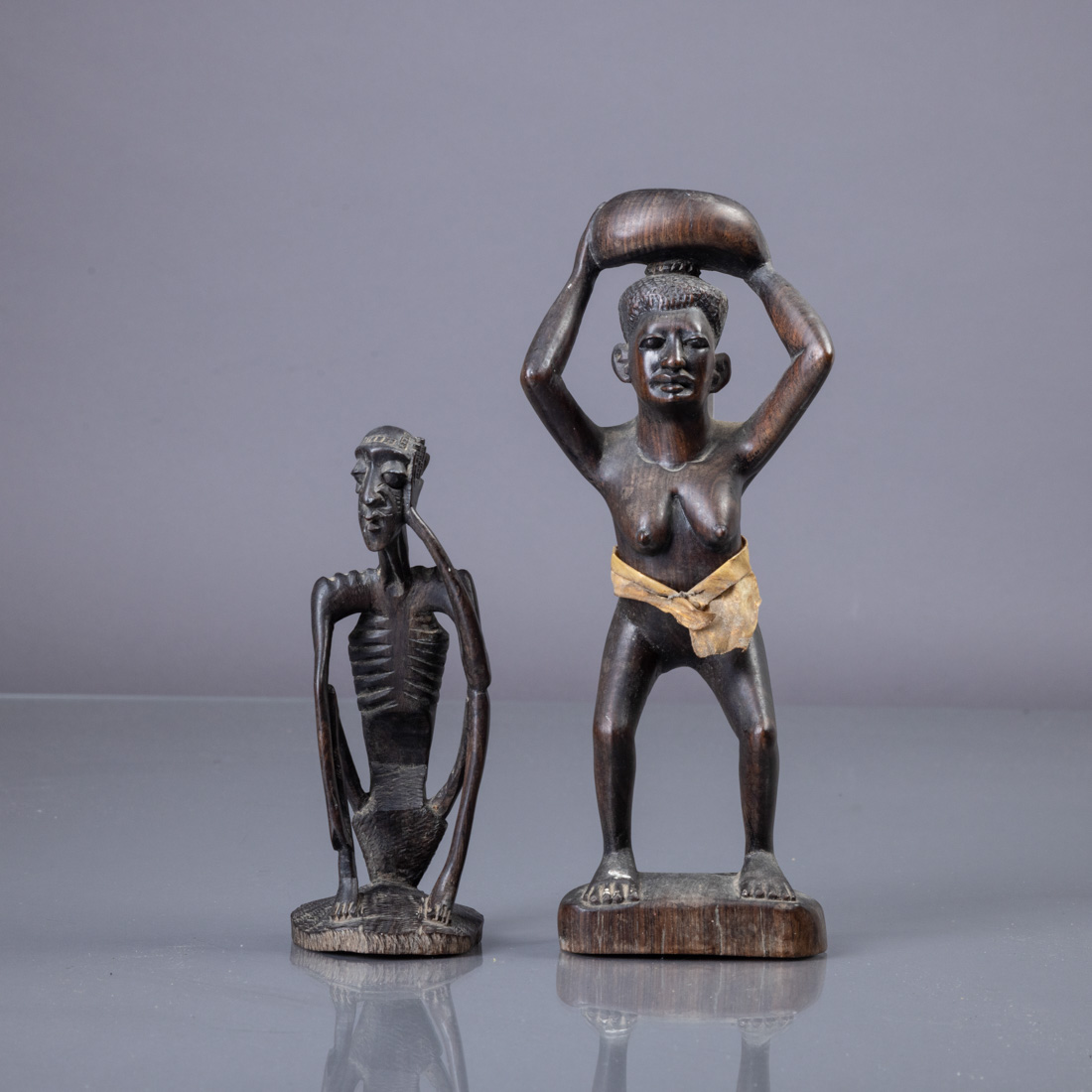 Esculturas em madeira exótica, representando figuras de nativos africanos. Anos 60. Sinais de uso.