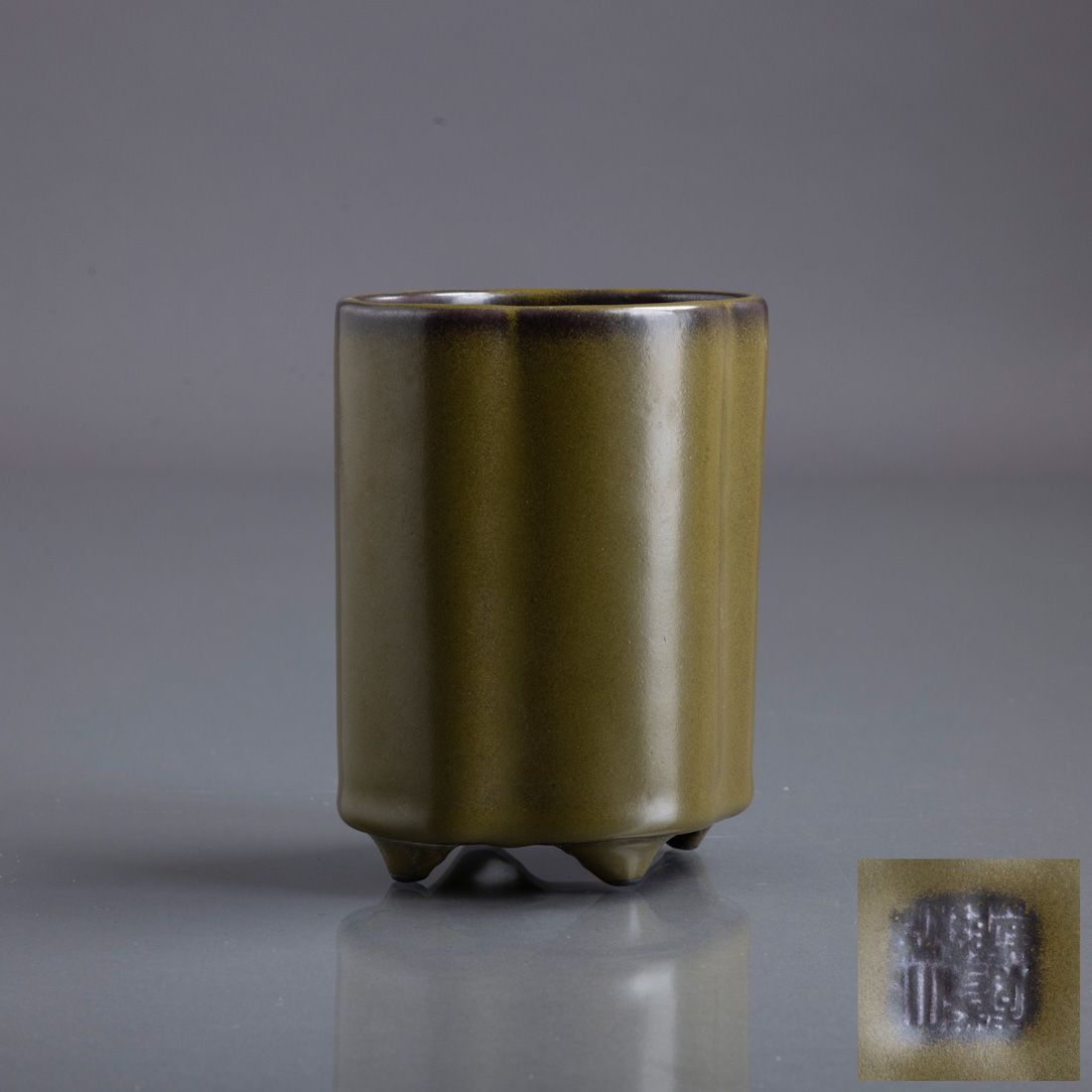 Em grés chinês vidrado, decoração monocroma a verde. Marcada. Sinais de uso.