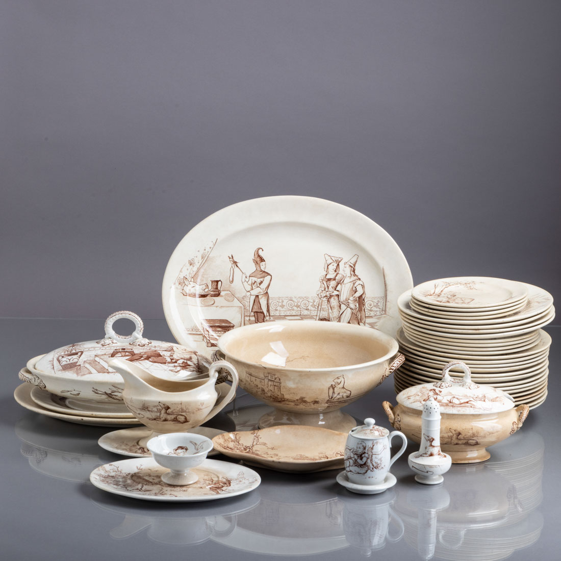 Em loiça pó de pedra W.B. & Son, decoração "Medieval" a castanho. Inglesa, Séc. XIX. Composição: 12 pratos rasos, 6 fundos, 4 de sobremesa, 4 de doce, 3 travessas, saladeira, 2 terrinas, molheira, conserveira, mostardeira, saleiro e pimenteiro. Craquelé,sinais de uso. 8 peças com defeitos (3 pratos rasos, 1 fundo, 1 travessa, tampa de terrina, saladeira e pimenteiro com esbeiçadelas e cabelos)