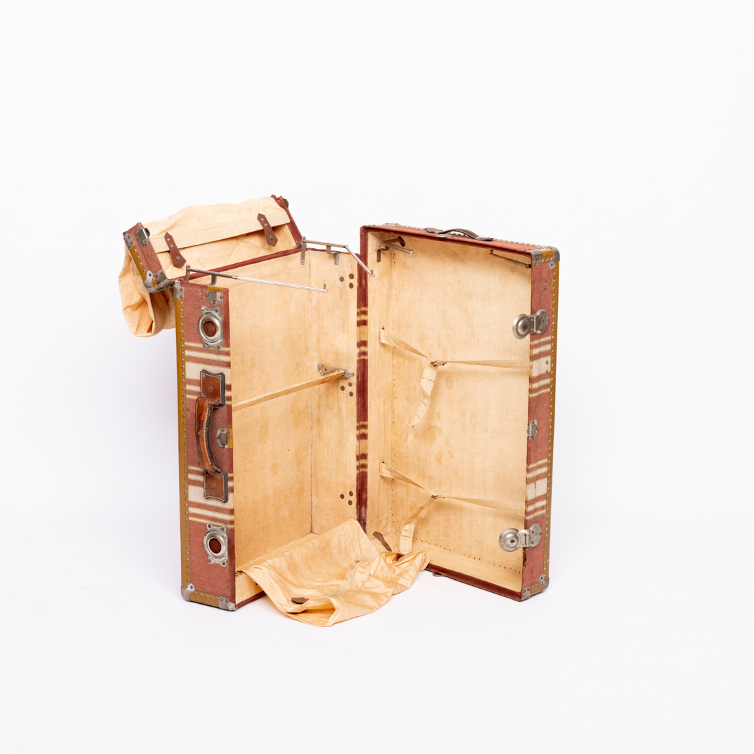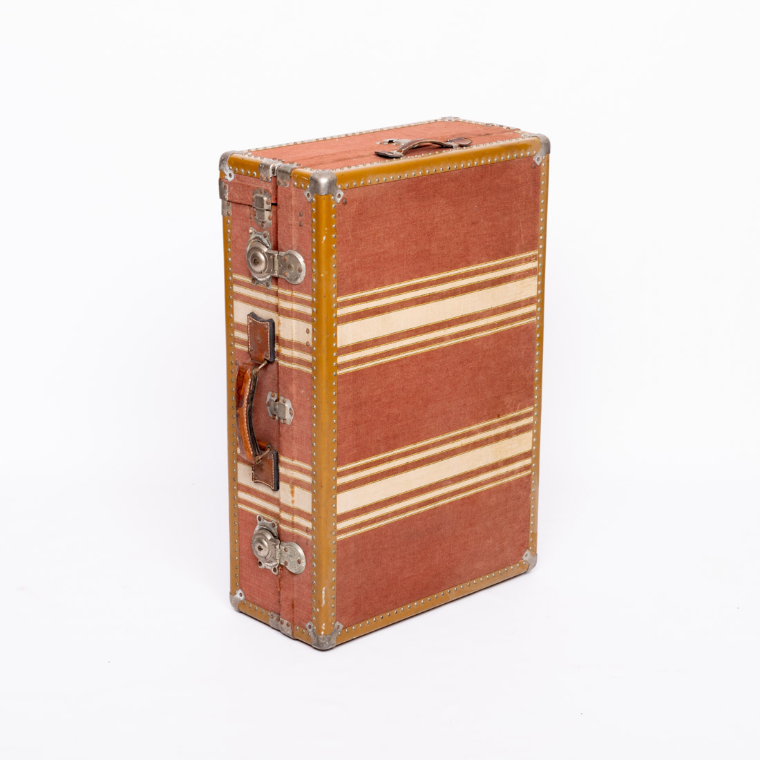 Revestida a tecido com aplicações em chapa, pegas em couro. Interior com divisórias. Pequenas falhas e defeitos.