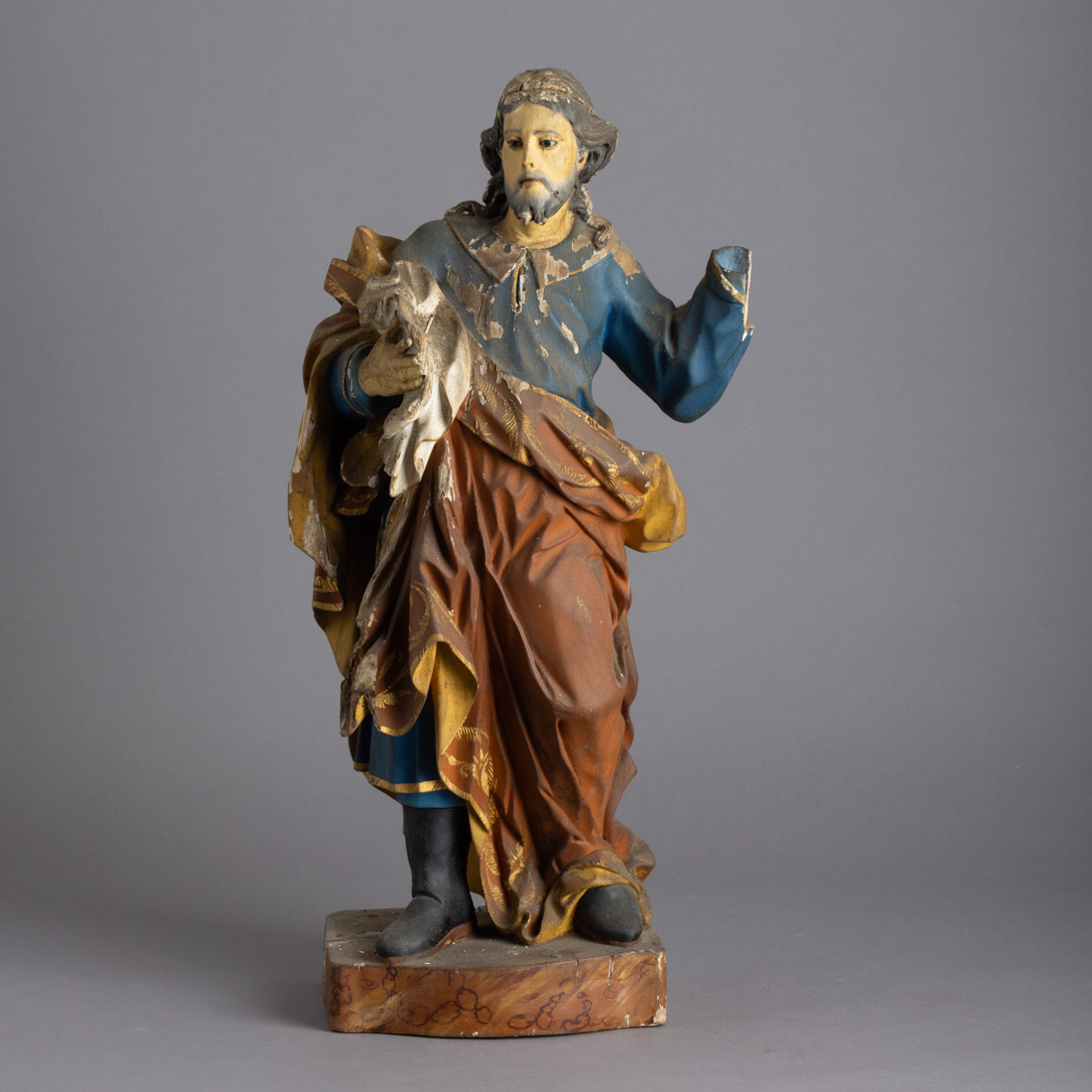 Escultura em madeira policromada e dourada, olhos de vidro. Séc. XVIII/XIX. Faltas, falhas e defeitos.