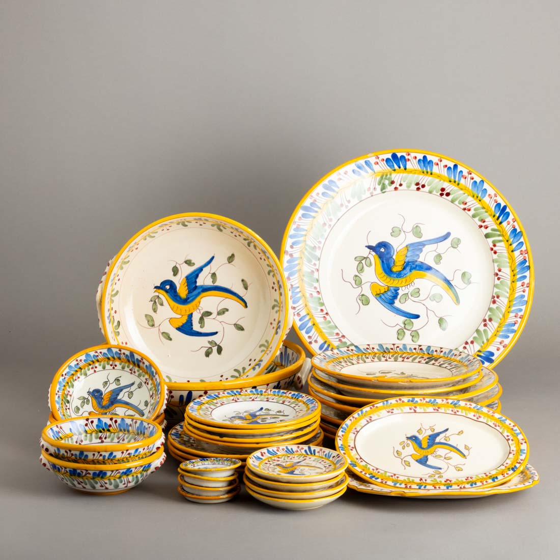 Em cerâmica vidrada, marcada Viúva Lamego, decoração policromada "Pássaro azul". Com 72 peças entre elas pratos, saladeiras, travessas, consumes, prato de servir. A maior parte com pequenas esbeiçadelas.