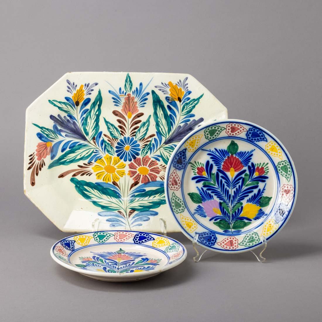 Em faiança portuguesa, decoração policromada com motivos florais. Travessa com cabelo, leve desgaste no vidrado.
