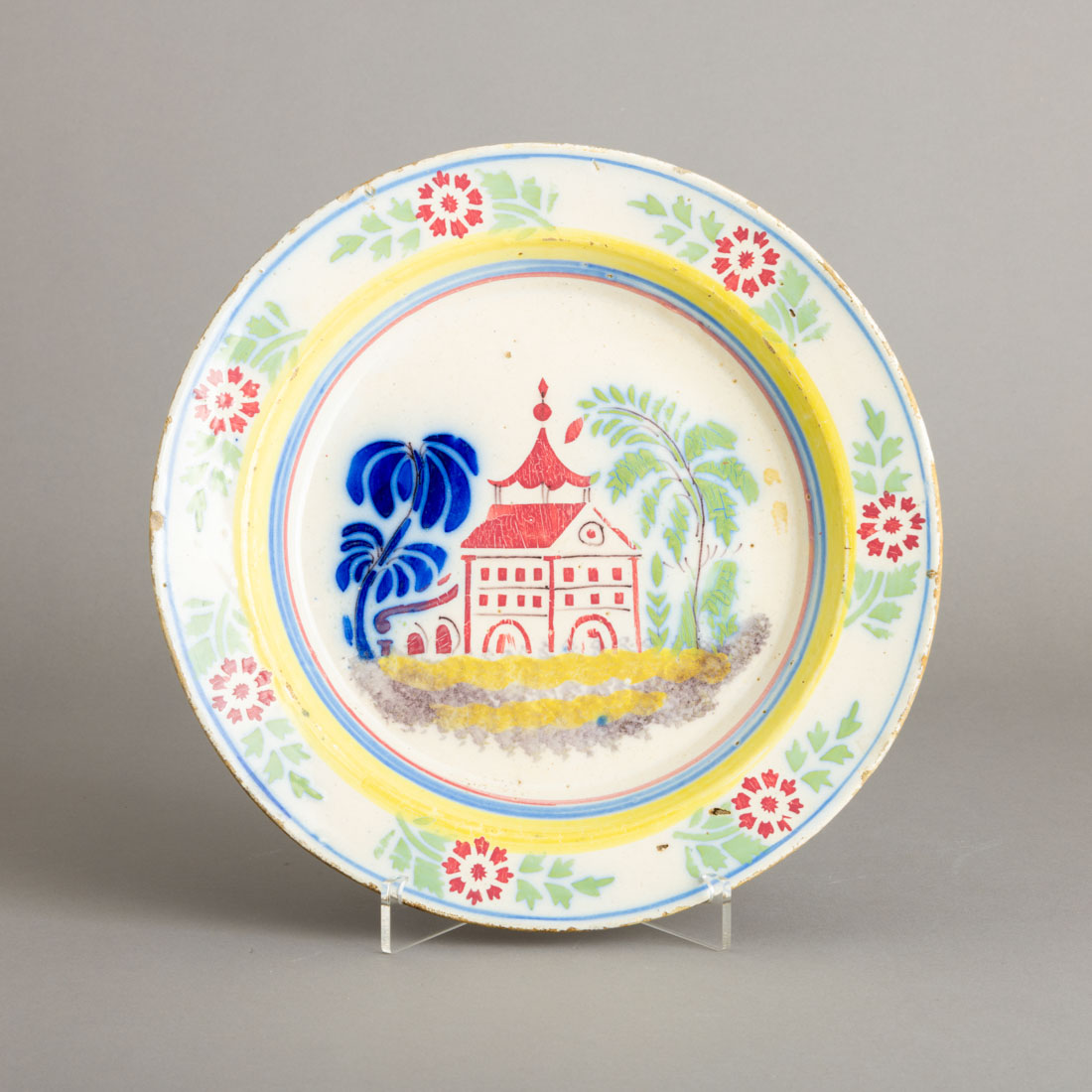 Em faiança portuguesa, decoração policromada com paisagem e flores. Séc. XIX. Pequenas esbeiçadelas e desgaste no vidrado.