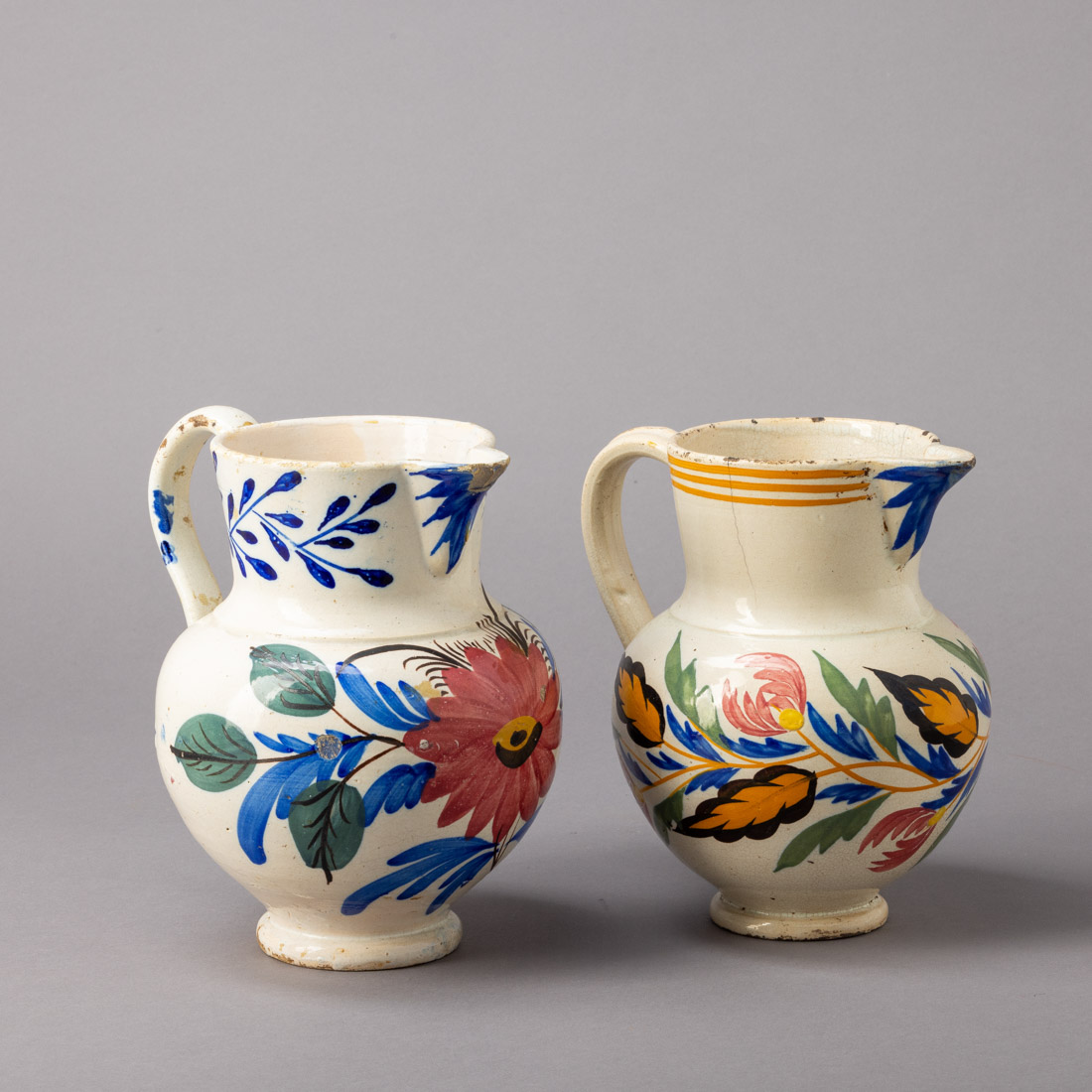 Em faiança portuguesa, decoração policromada "flores". Esbeiçadelas, desgaste no vidrado, um com cabelos.