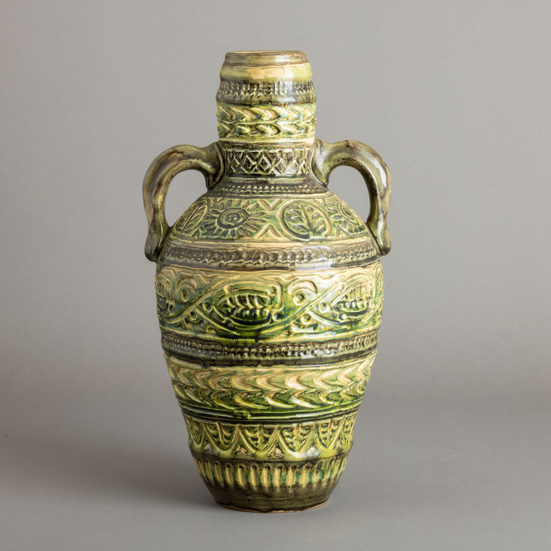 Em cerâmica vidrada fabrico Aleluia - Aveiro, decoração relevada com elementos geométricos em tons de verde. Sinais de uso, leve desgaste no vidrado.