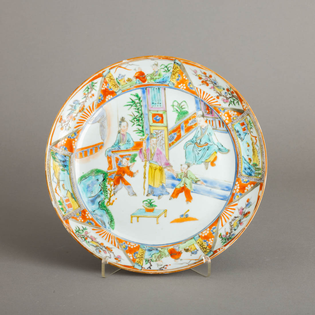 Em porcelana da China, Séc. XIX, decoração com esmaltes policromados e dourados "Cena do quotidiano" na aba flores e paisagens Desgaste no dourado e pequenas esbeiçadelas.