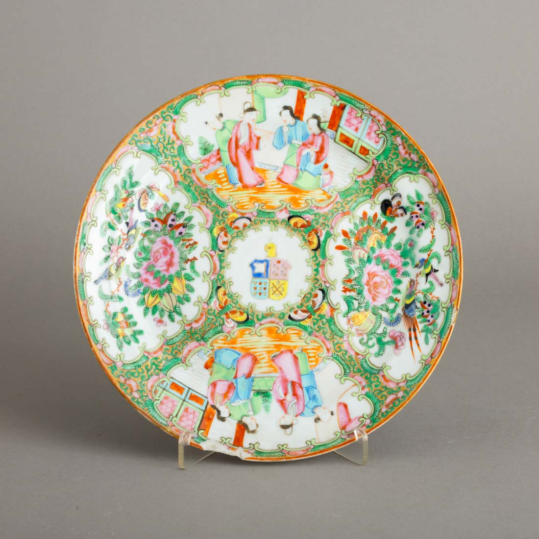 Em porcelana da China, Séc. XIX/XX decoração "Mandarim" policromada e dourada, reservas com cenas do quotidiano, flores e insectos. Esbeiçadelas e cabelos.