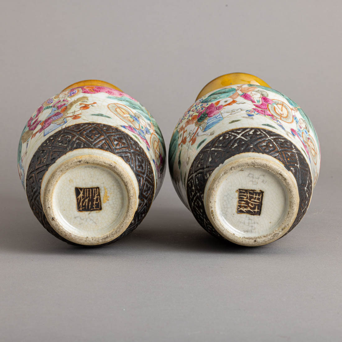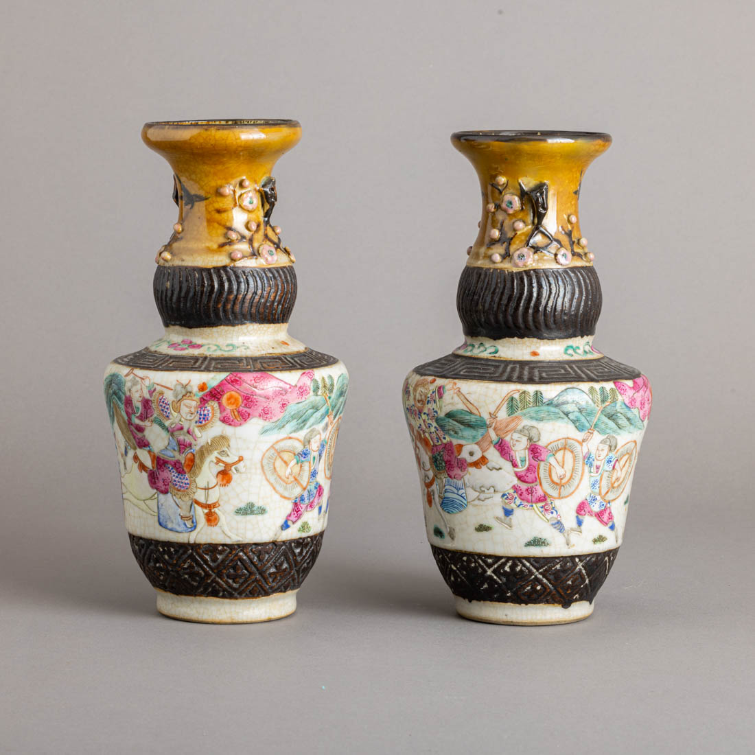 Em cerâmica japonesa de Satsuma, decoração policromada e relevada com flores e "Cenas de batalha". Período Meiji (1868-1912). Marcada. Sinais de uso, restauros no bordo.