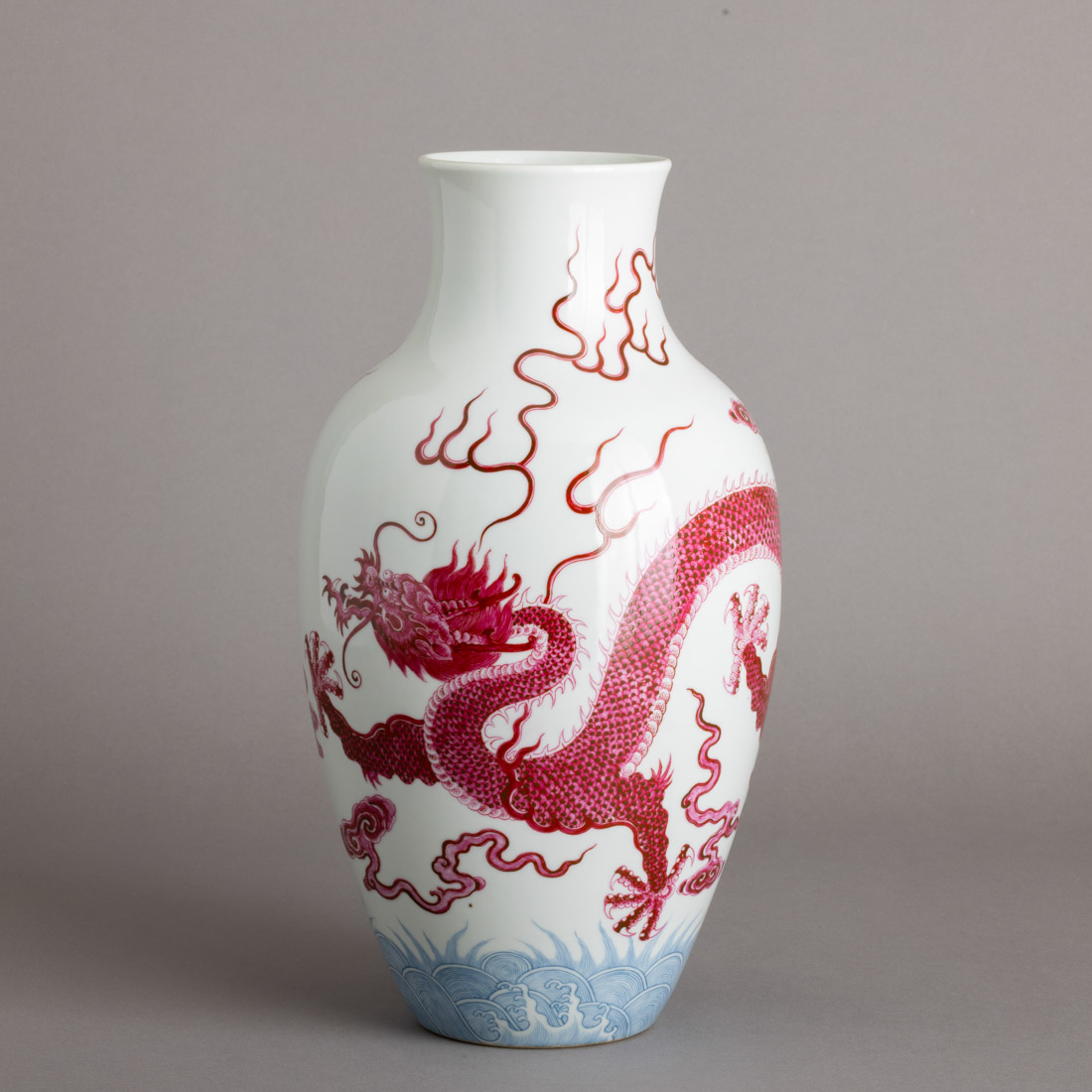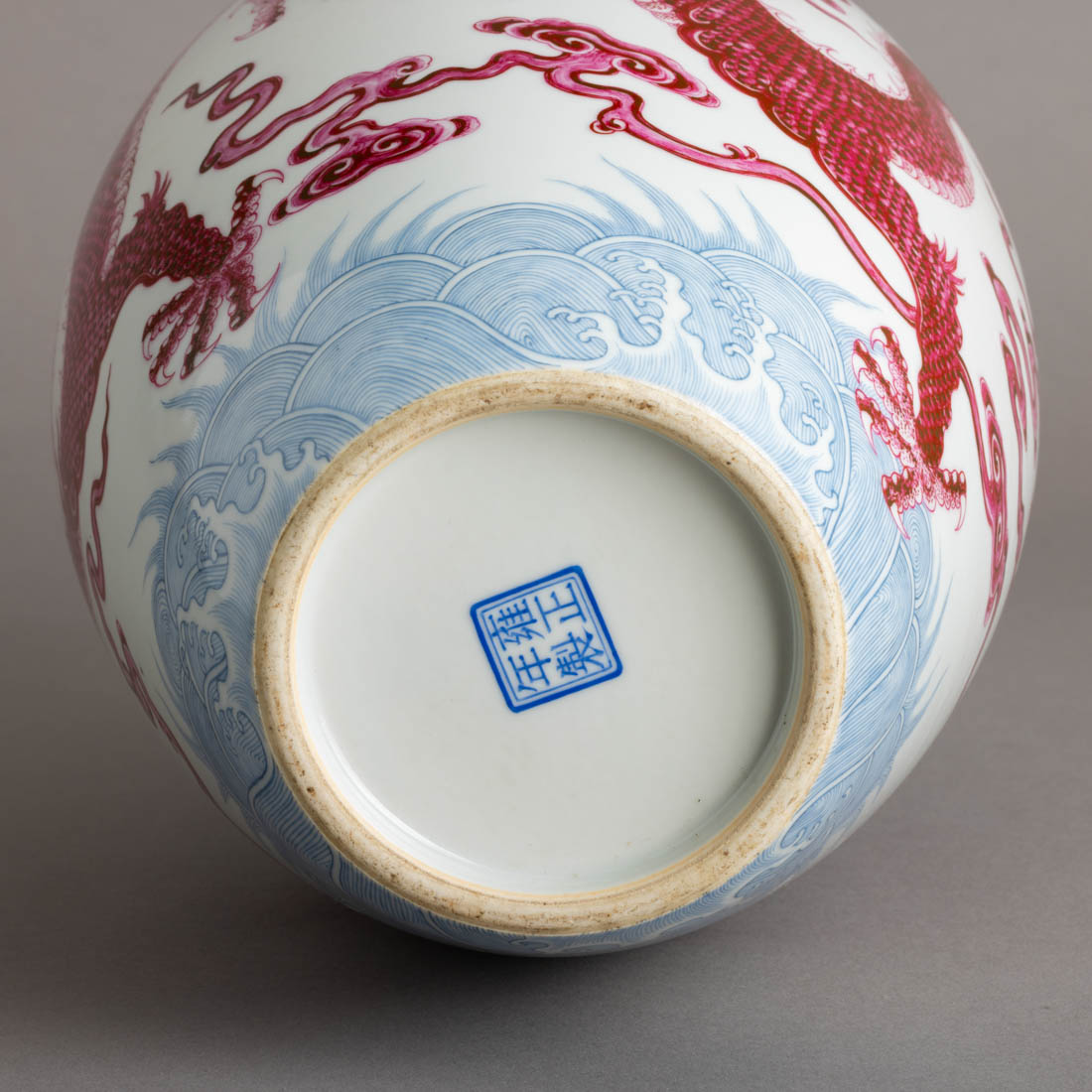 Em porcelana da China, decoração policromada representando dragão entre nuvens e ondas. Marcada. Sinais de uso.
