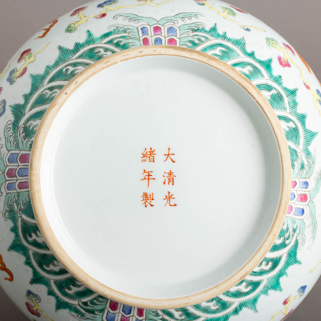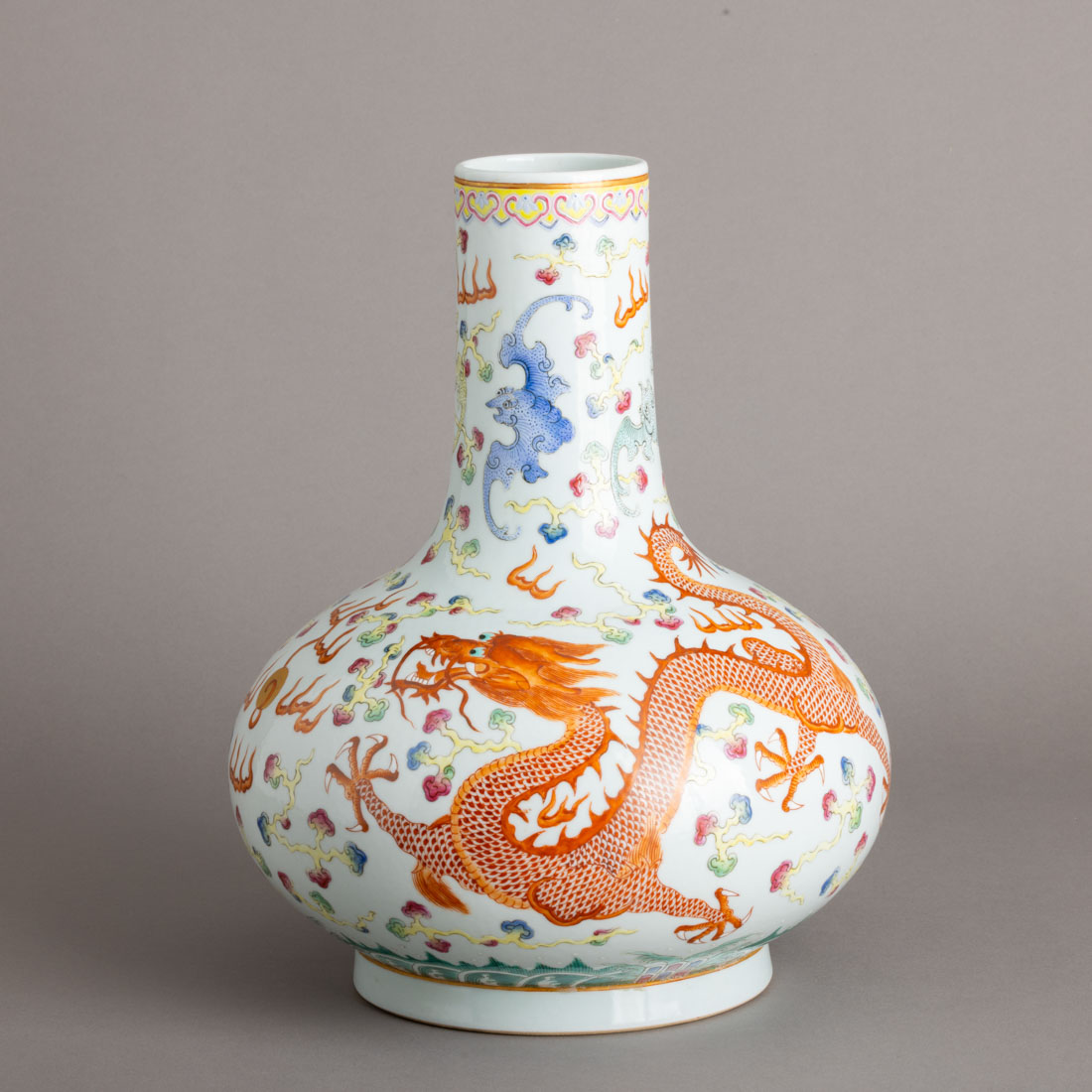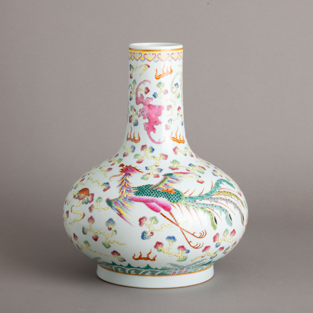 Em porcelana da China, decoração policromada e dourada "dragão, fénix e morcegos". Marcada. Sinais de uso.