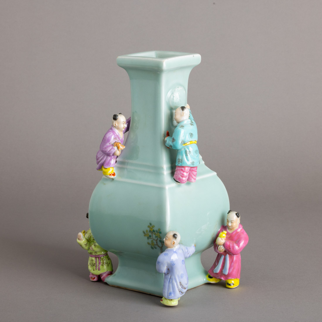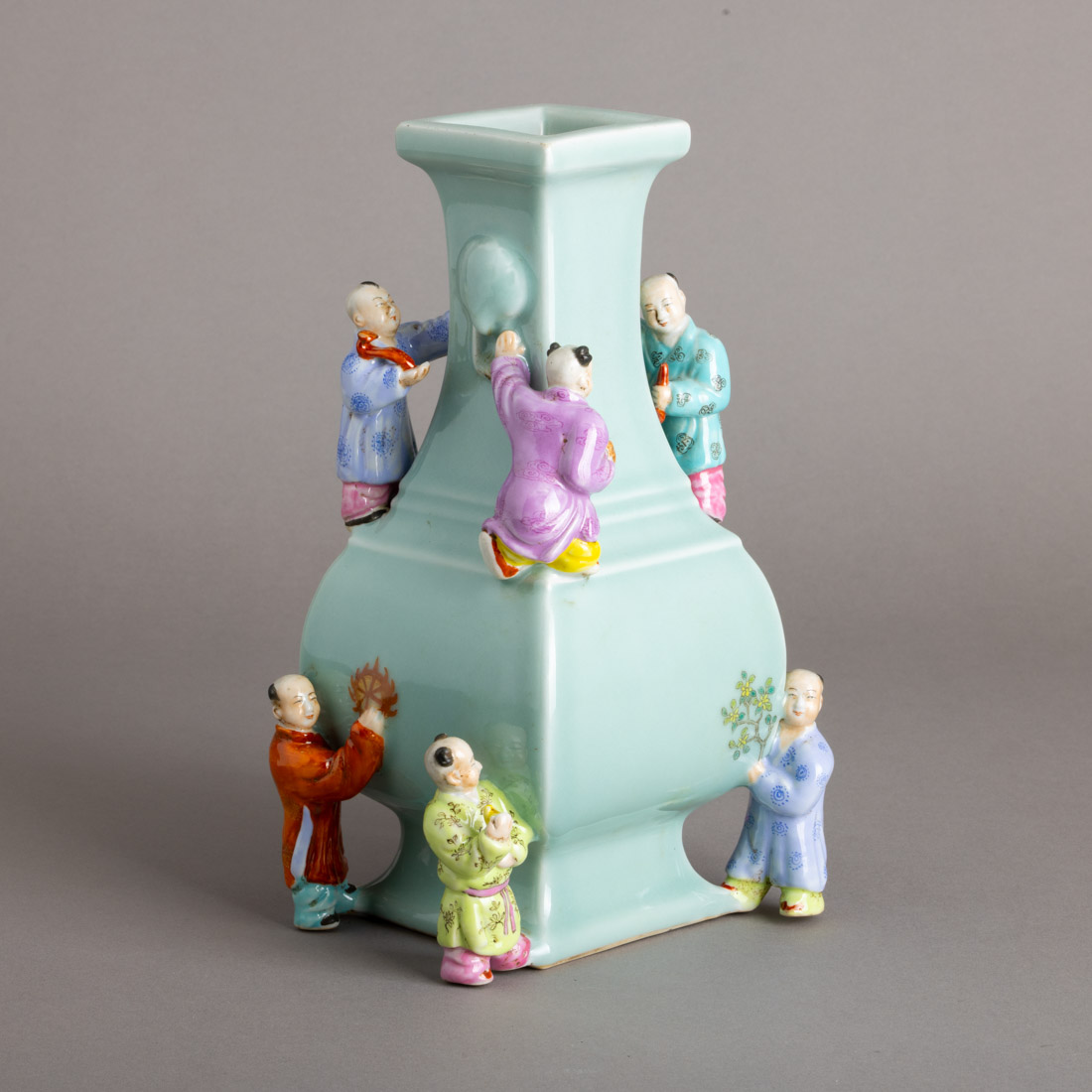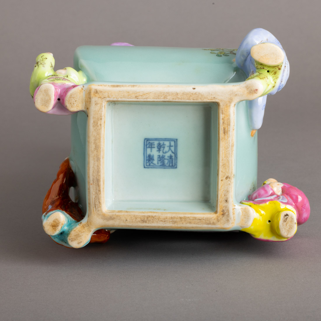 Em porcelana da China, decoração policromada e relevada "Laughing boys", sobre fundo verde celadon. Marcada. Sinais de uso.