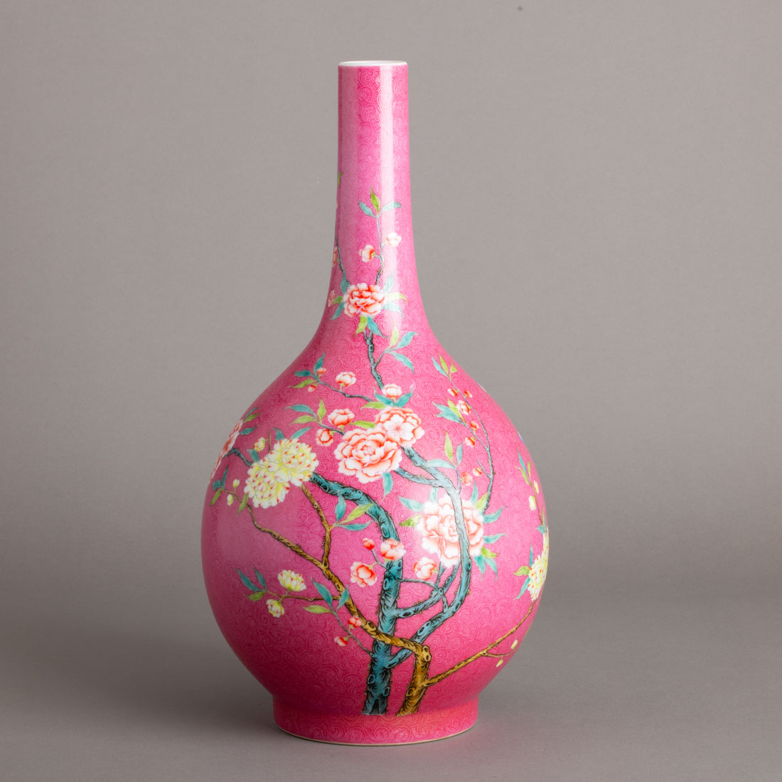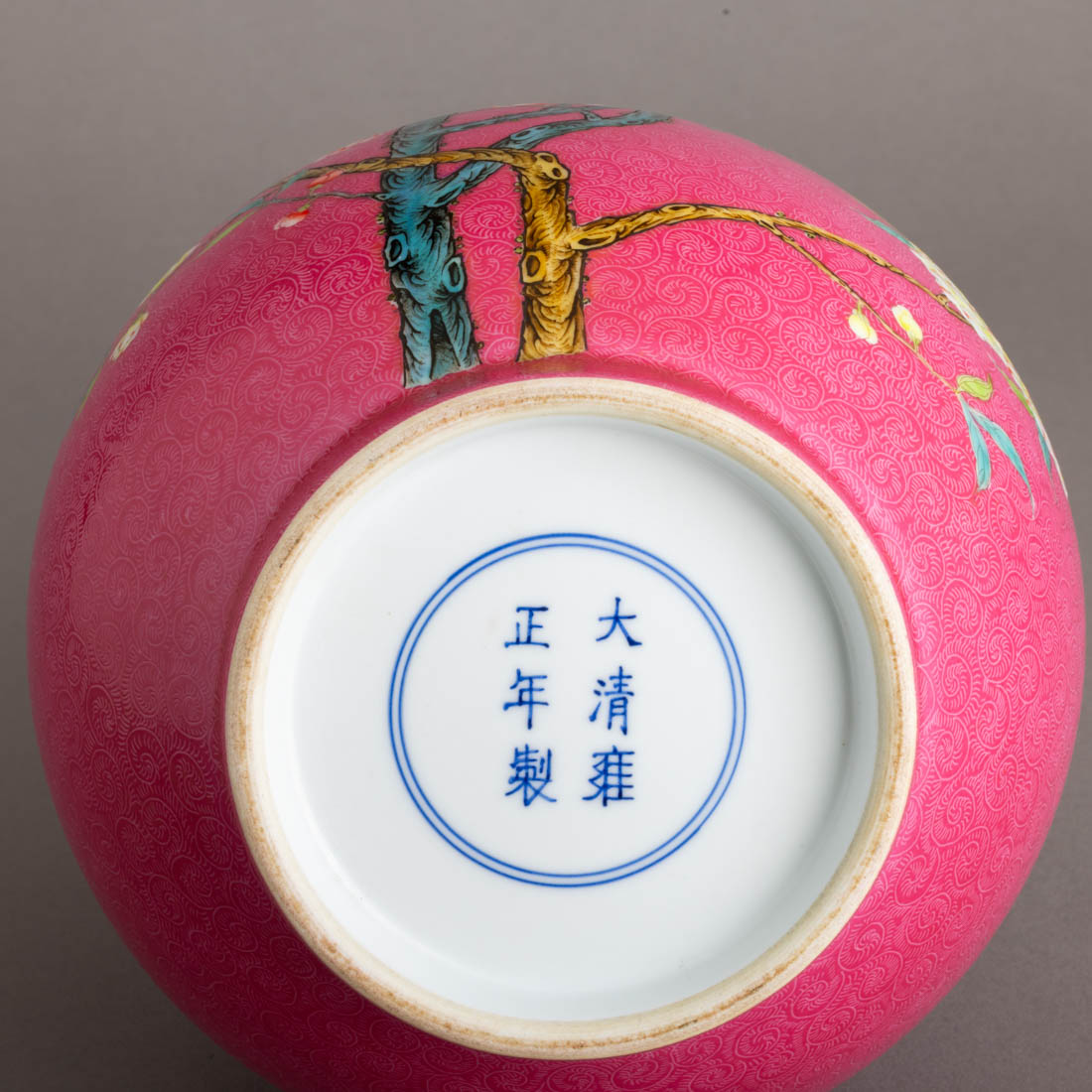 Em porcelana da China, decoração policromada "ramos com flores e borboletas" sobre fundo rosa com gravados. Marcada. Sinais de uso.
