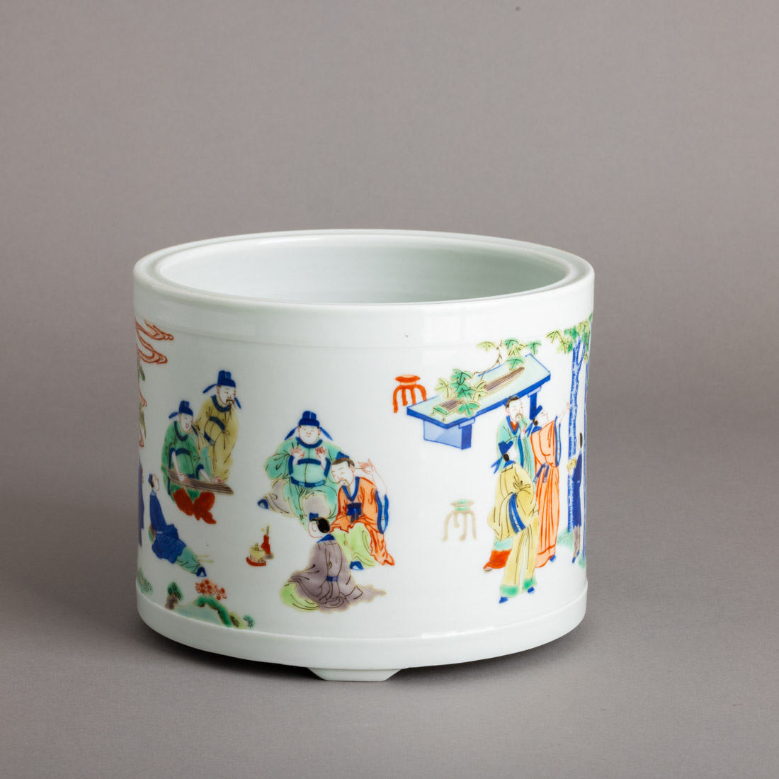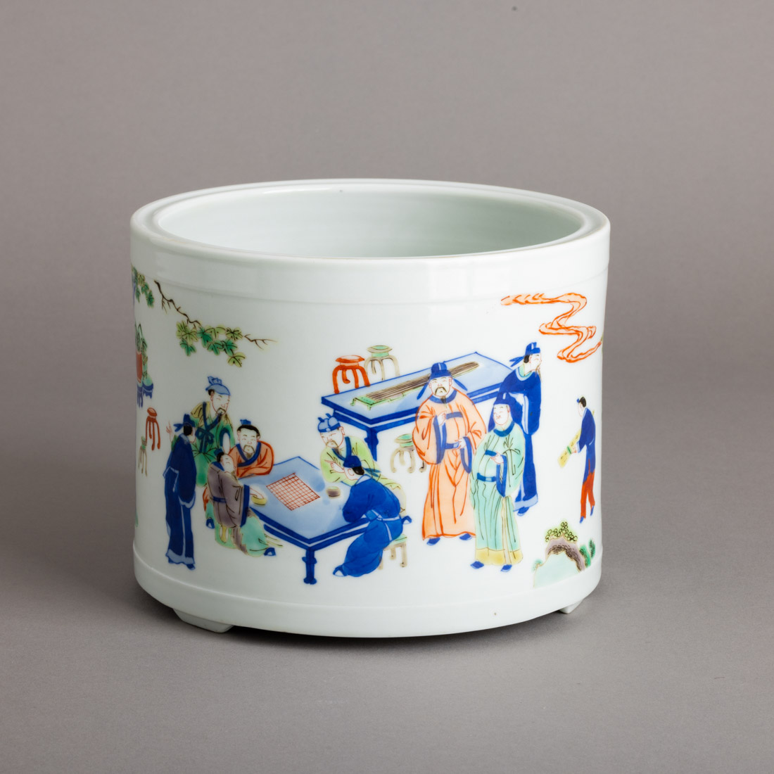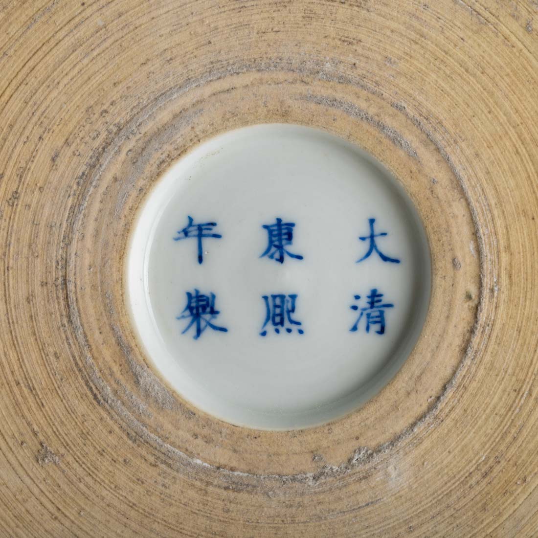 Em porcelana da China, decoração com esmaltes policromos da família verde "paisagem com cenas do quotidiano". Marcada. Sinais de uso.