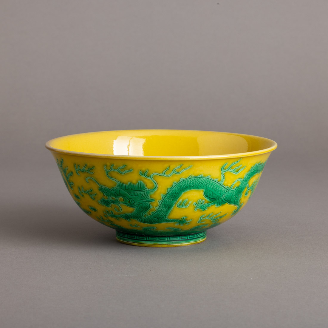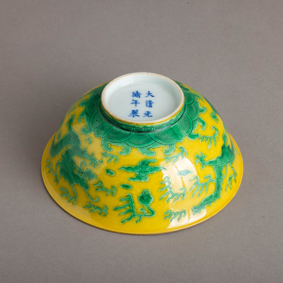Em porcelana da China, decoração a verde gravada "dragões entre nuvens" sobre fundo amarelo. Marcada. Sinais de uso.
