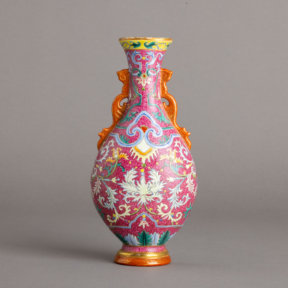 Em porcelana da China, decoração policromada e dourada, "flores e enrolamentos de lótus", sobre fundo rosa com gravados. Marcada. Sinais de uso.