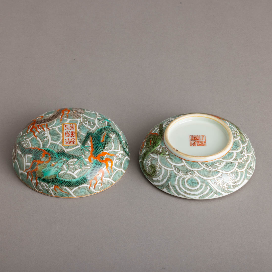 Em porcelana da China, decoração com esmaltes policromos da família verde "dragões entra ondas" e caracteres. Marcada. Sinais de uso.