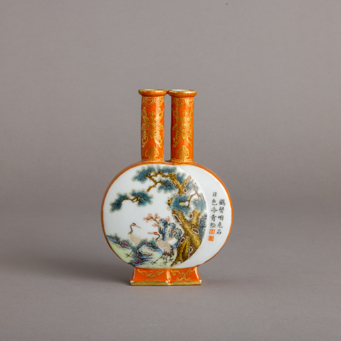 Em porcelana da China, decoração rouge de fer e a dourado, reservas policromas "paisagens com pássaros" e caracteres. Marcada. Sinais de uso e leve desgaste.