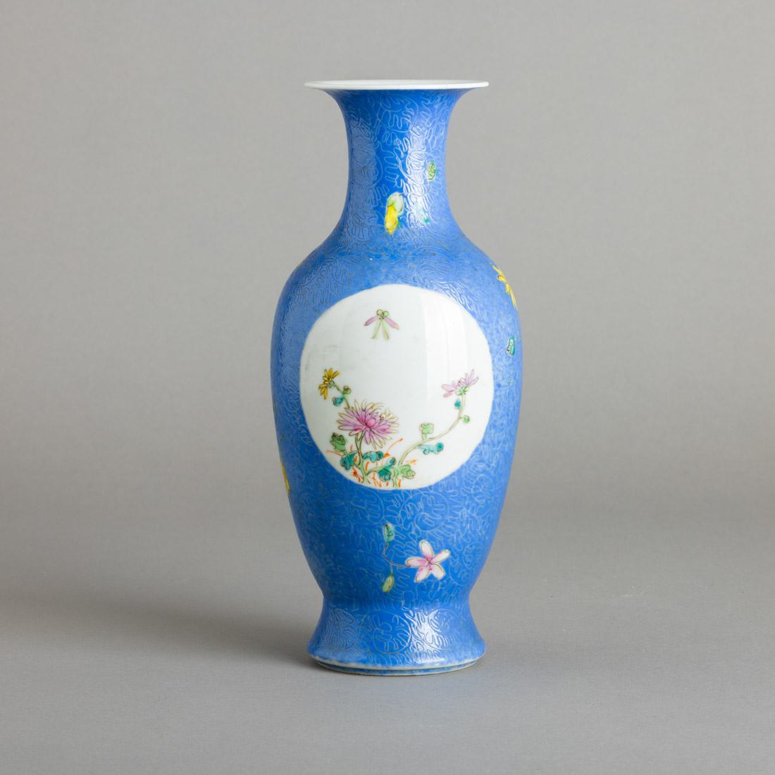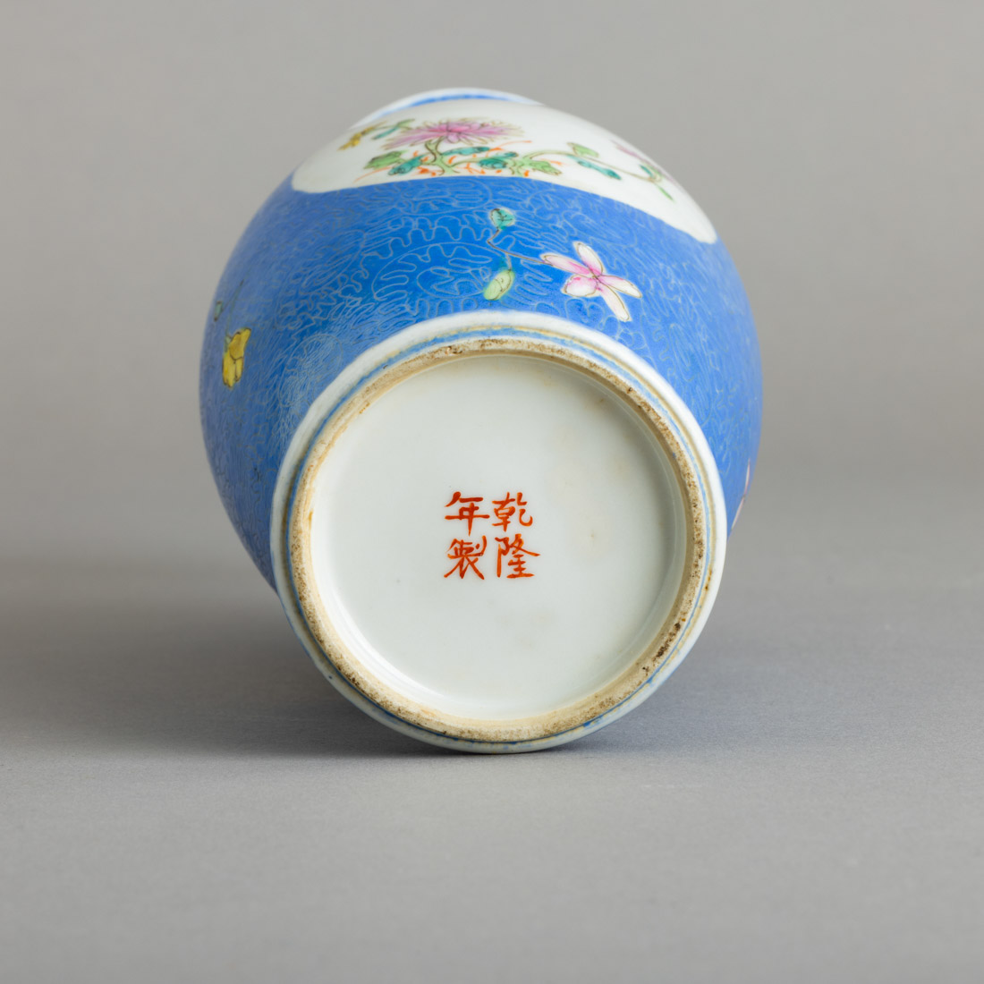 Em porcelana da China, decoração policromada "flores e insectos" sobre fundo azul com gravados. Marcada. Desgaste e pequeno cabelo na boca.