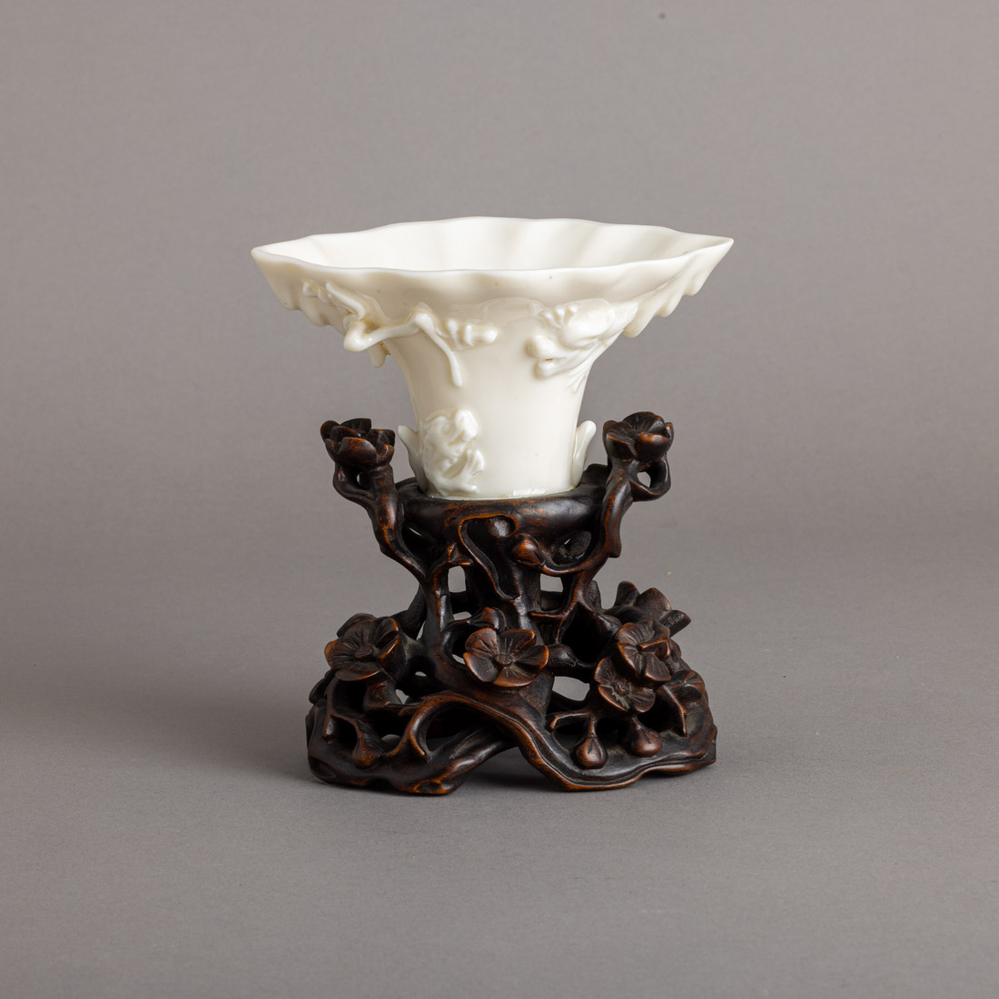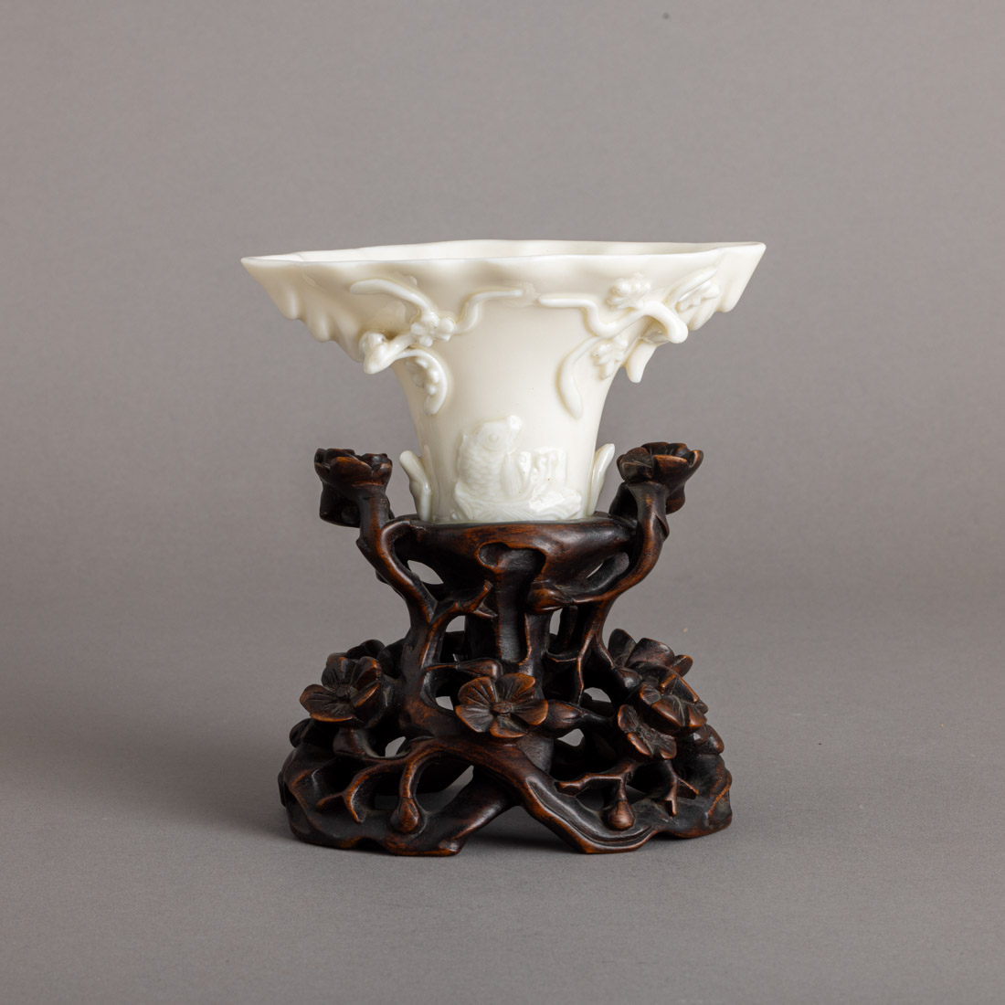 Em porcelana da China, decoração "Blanc-de-Chine" relevada com flores, dragões e peixe, base em madeira entalhada e vazada "ramos e flores". Sinais de uso.
