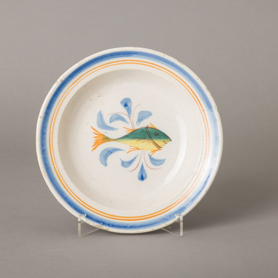 Em faiança portuguesa, decoração policromada "peixe". Séc. XIX/XX. Sinais de uso e desgaste no vidrado do bordo.