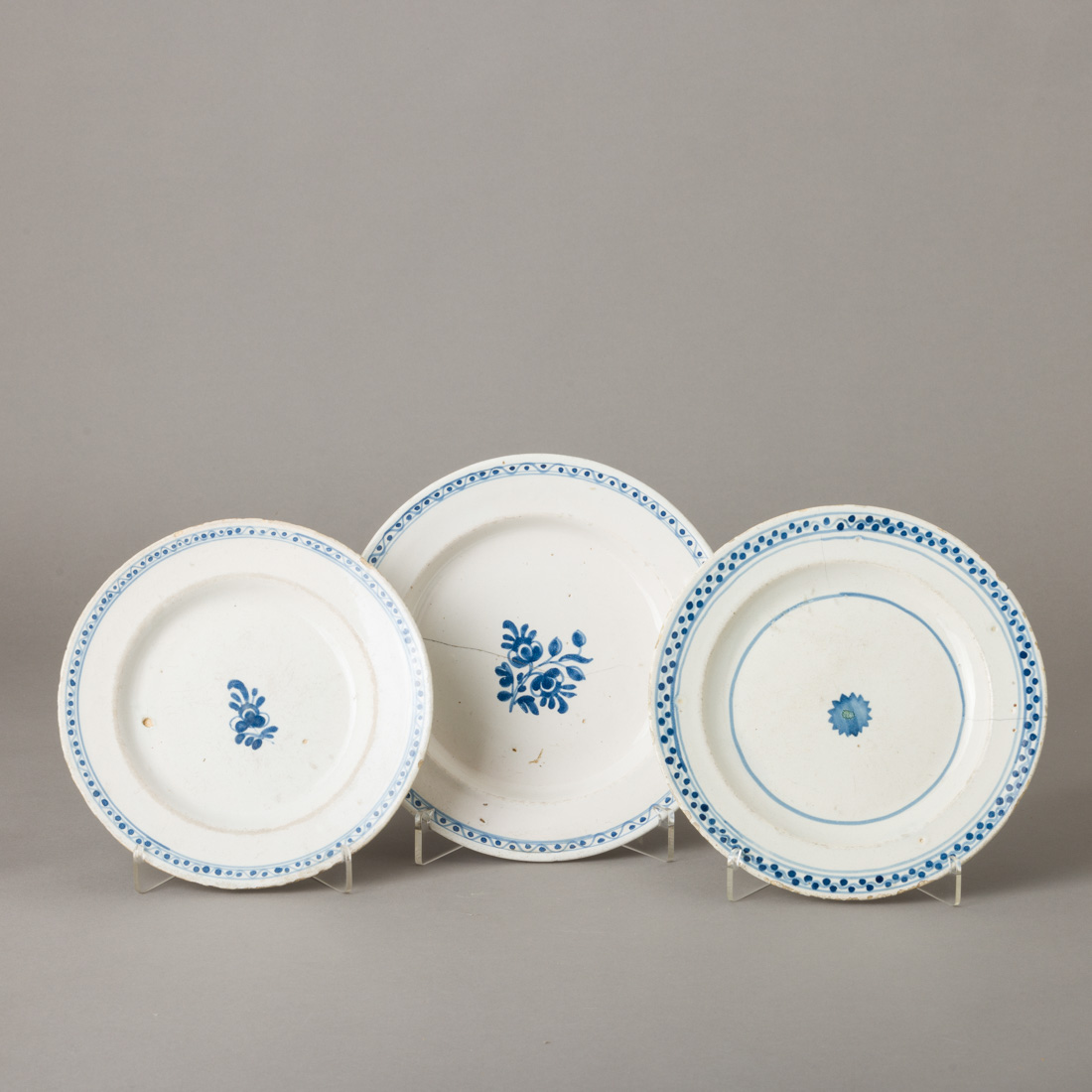 Em faiança portuguesa de Viana, Séc. XVIII/XIX, decoração a azul "arranjo floral", no bordo friso de ponteados, dois marcados "V". Desgaste, esbeiçadelas, dois com cabelos e um gateado.