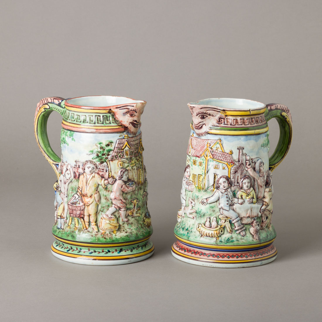 Em faiança portuguesa da Fábrica do Outeiro Águeda, decoração relevada e policromada "cena rural com figuras". Pequenas esbeiçadelas, um com cabelos e ligeiro desgaste.