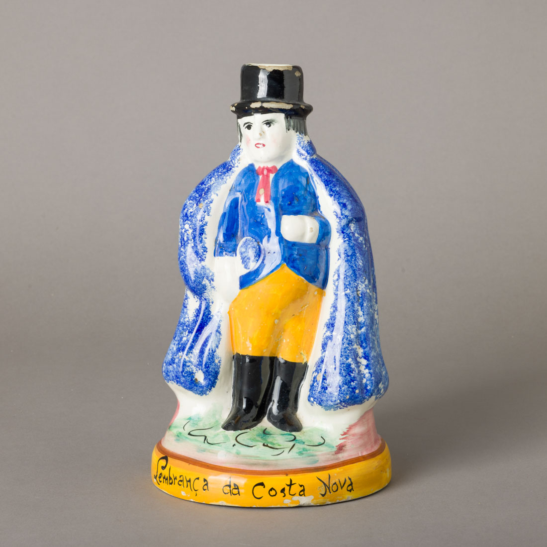 Em faiança portuguesa, decoração relevada e policromada, inscrição "Lembrança da Costa Nova". Séc. XX. Esbeiçadelas e desgaste no vidrado.