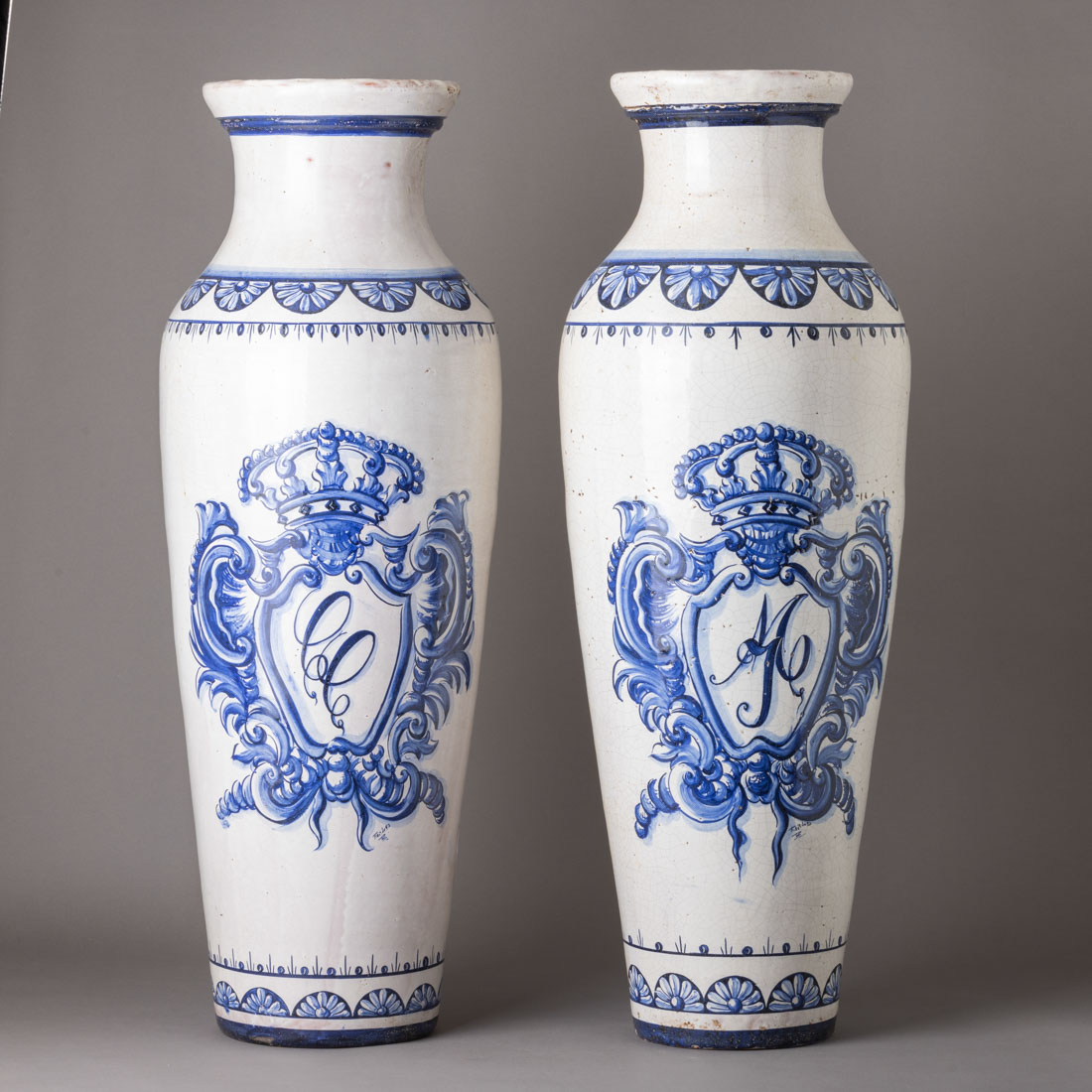 Em barro vidrado, decoração a azul "cartela monogramada encimada por coroa", assinado e datado 1993. Sinais de uso e craquelé.