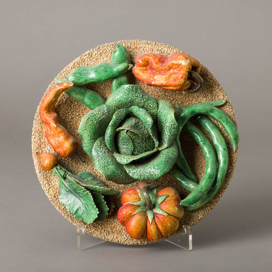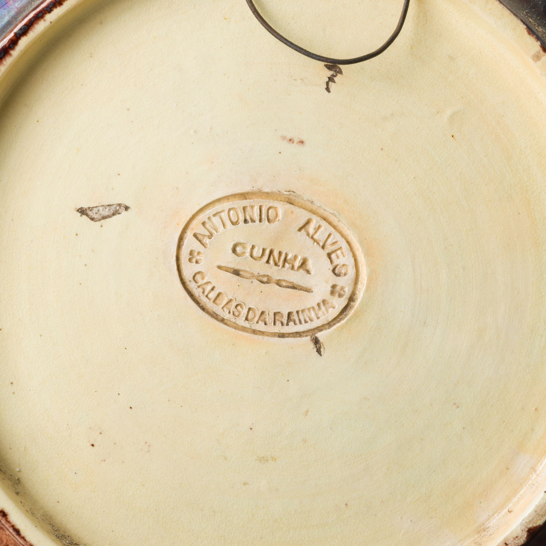 Em cerâmica vidrada das Caldas, decoração relevada e policromada sobre fundo areado, marcada António Alves Cunha - Caldas da Rainha, Séc. XIX/XX. Sinais de uso e ínfimas falhas nas pontas do feijão verde.