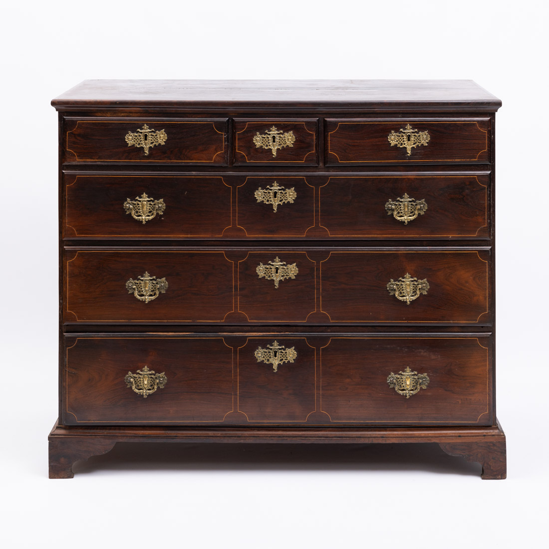 Em pau santo, de três gavetões e três gavetas com filetes embutidos, ferragens em metal amarelo. Pequenos defeitos.