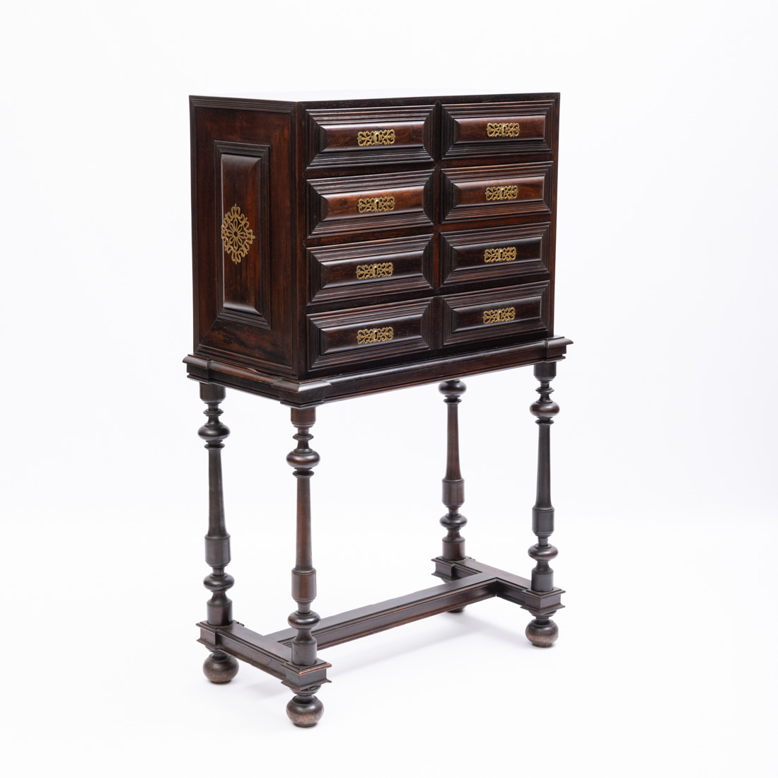 Em pau santo, de sete gavetas simulando oito, ferragens em metal amarelo, decoração de almoladas, trempe de pernas torneadas. Sinais de uso.