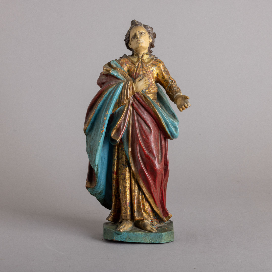 Escultura em madeira, decoração policromada e dourada. Pequenas falhas, defeitos e alguns restauros.
