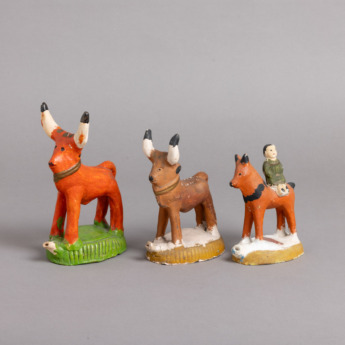 Esculturas em barro pintado, possivelmente de Barcelos, decoração policromada. Pequenas esbeiçadelas e dois com colagem.