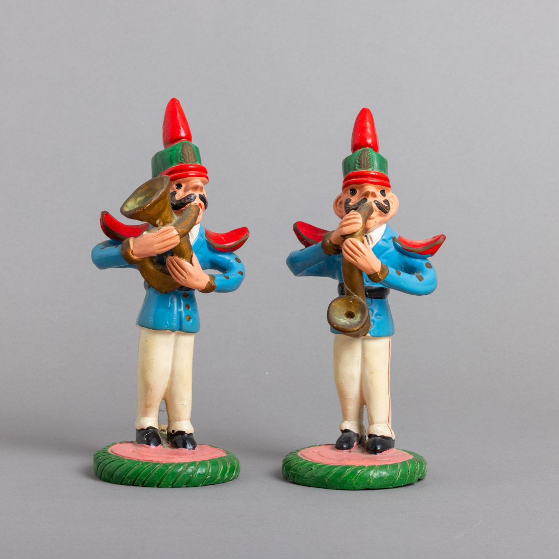 Esculturas em barro pintado, decoração policromada, com legenda "Tupperware Jubileu 1984". Pequenas falhas e colagens.