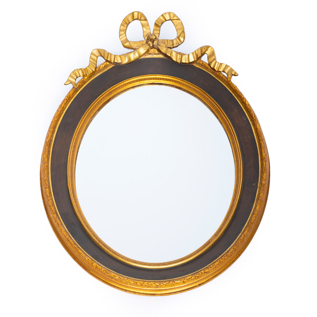Estilo D. Maria, moldura em madeira e gesso entalhado, pintado e dourado, encimado por laço. Pequenas falhas e defeitos.