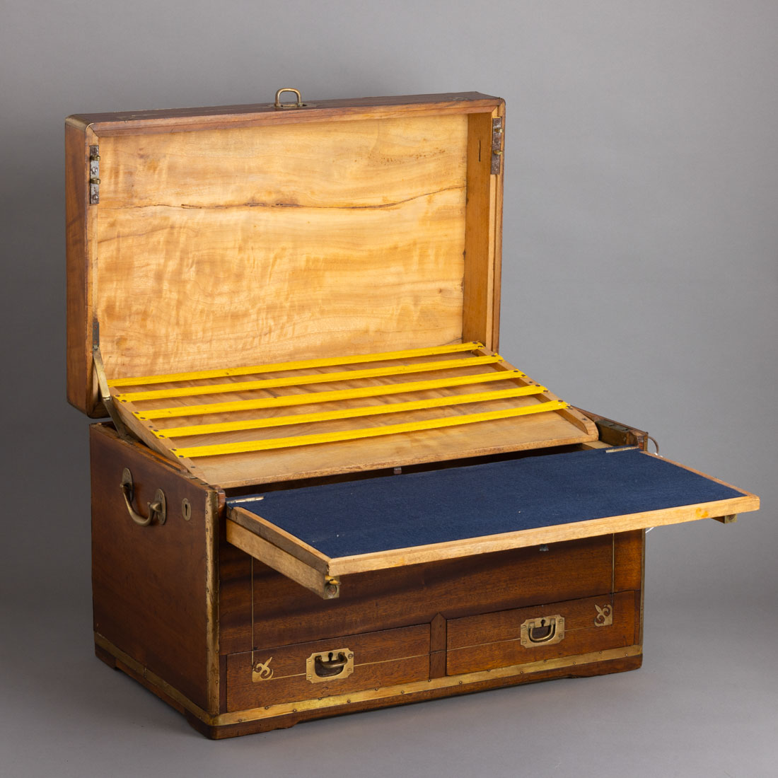Em mogno e outras madeiras, ferragens e aplicações em metal amarelo, interior compartimentado. Com chave. Sinais de uso, pequenas falhas e amolgadelas.