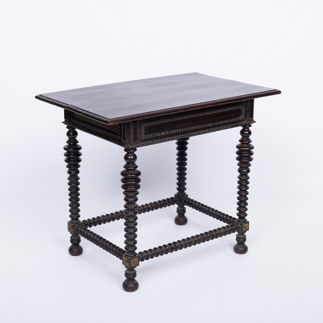 Em madeira escurecida, de duas gavetas com friso de tremidos, pernas e travessas torneadas, ferragens em metal amarelo. Sinais de uso e pequenos defeitos.