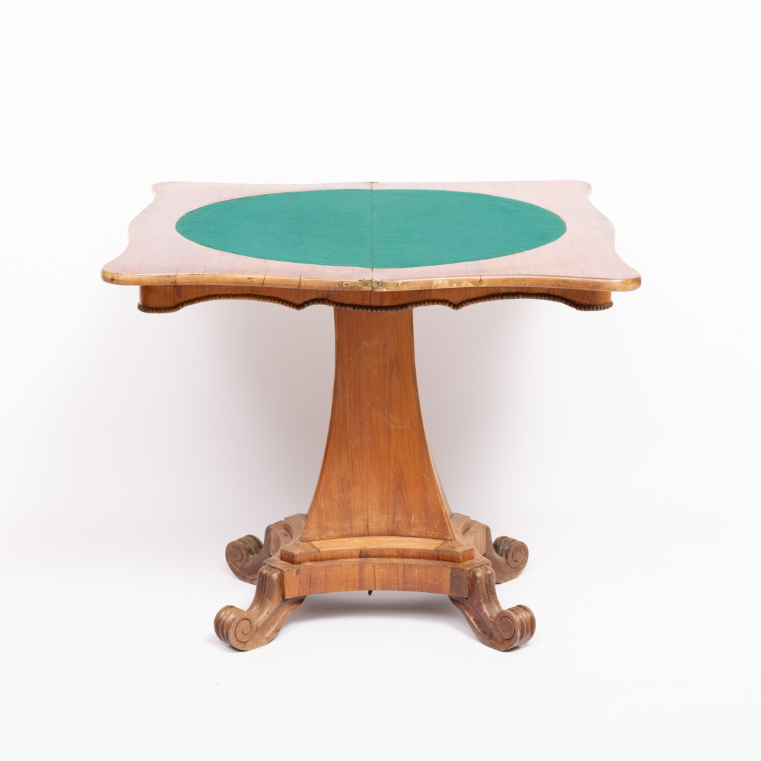 Em pau óleo e outras madeiras, tampo recortado, friso relevado, coluna piramidal e pés curvos. Sinais de uso, pequenas falhas, defeitos e vestígios xilófagos.