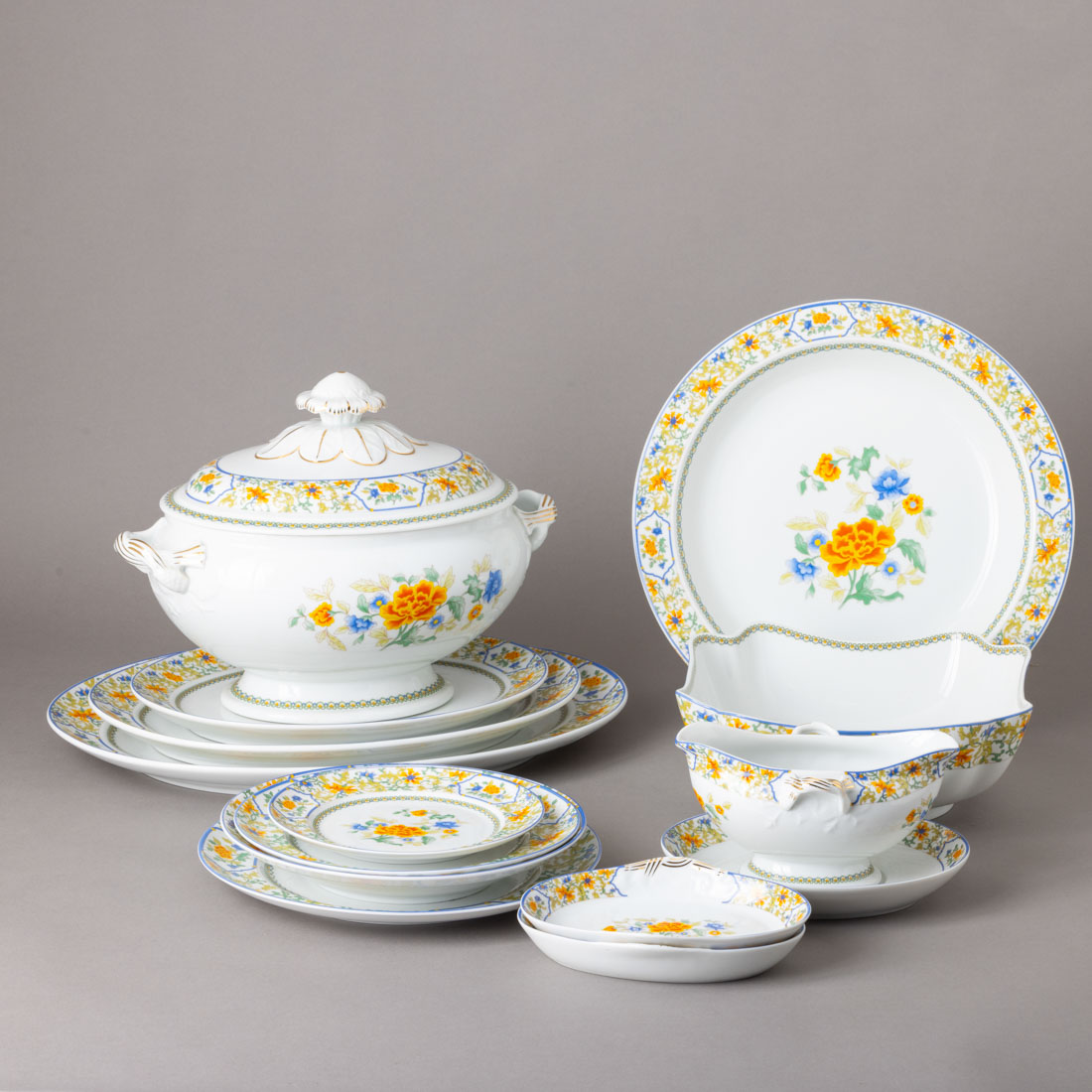 Em porcelana moldada (1992-1994), decoração policromada e dourada "flores", Composto por 24 pratos rasos, 12 fundos, 12 sobremesa, 12 doce, terrina, 4 travessas, prato de servir, saladeira, molheira com travessa e 2 conserveiras. Sinais de uso.