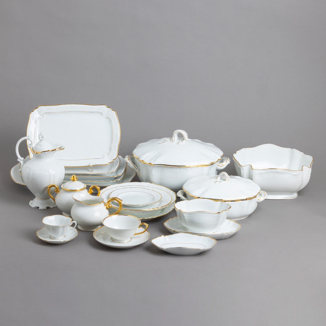 Em porcelana moldada (1947-1968), decoração com filetes a dourado. Composto por 24 pratos rasos, 12 fundos, 12 de sobremesa, 12 de doce, molheira, saladeira, 5 travessas, 2 terrinas, 2 azeitoneiras, 12 chávenas de café com pires, 1 chávena de chá e 3 pires, leiteira, açucareiro e cafeteira. Sinais de uso e um prato raso e um fundo com esbeiçadela.